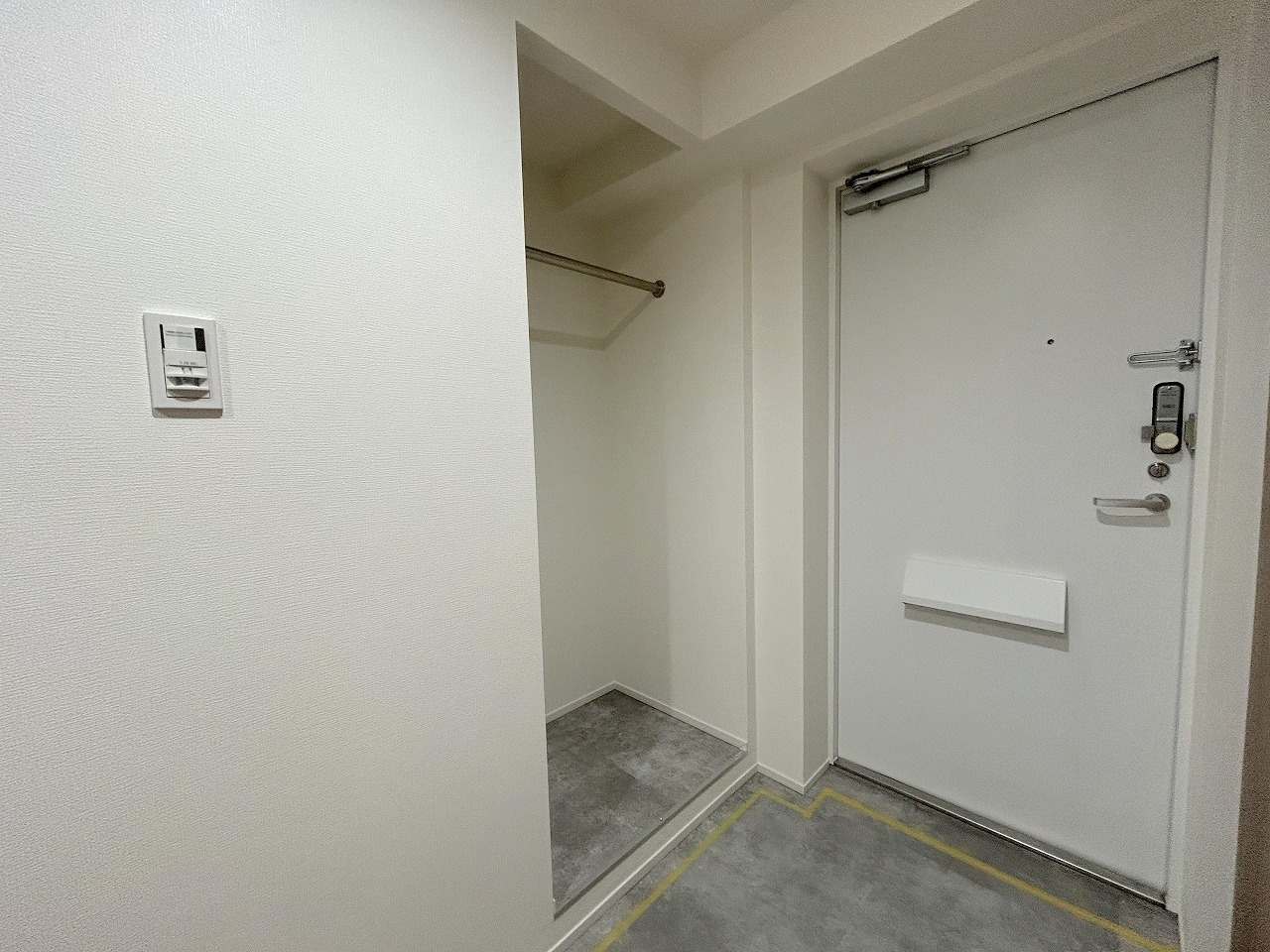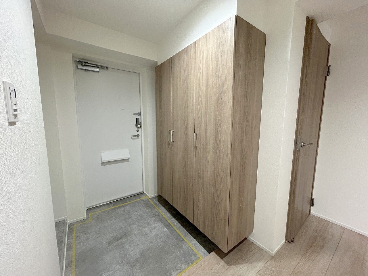 玄関横に収納付き、雨具や三輪車を置いても余裕の広さ。