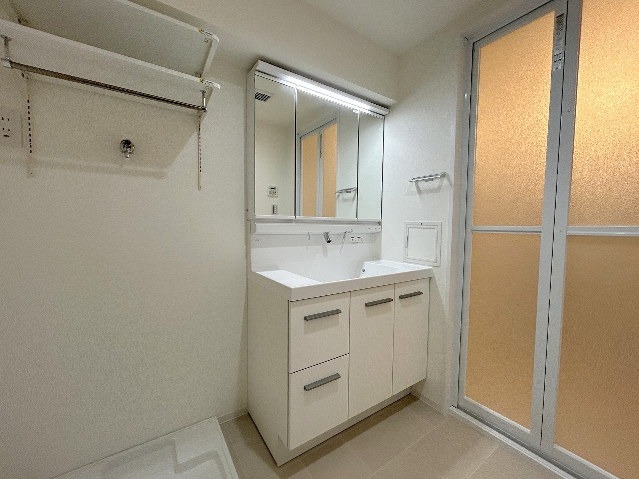 収納豊富な三面鏡付洗面化粧台。水回りのあれこれがキレイに収まりそうですね。