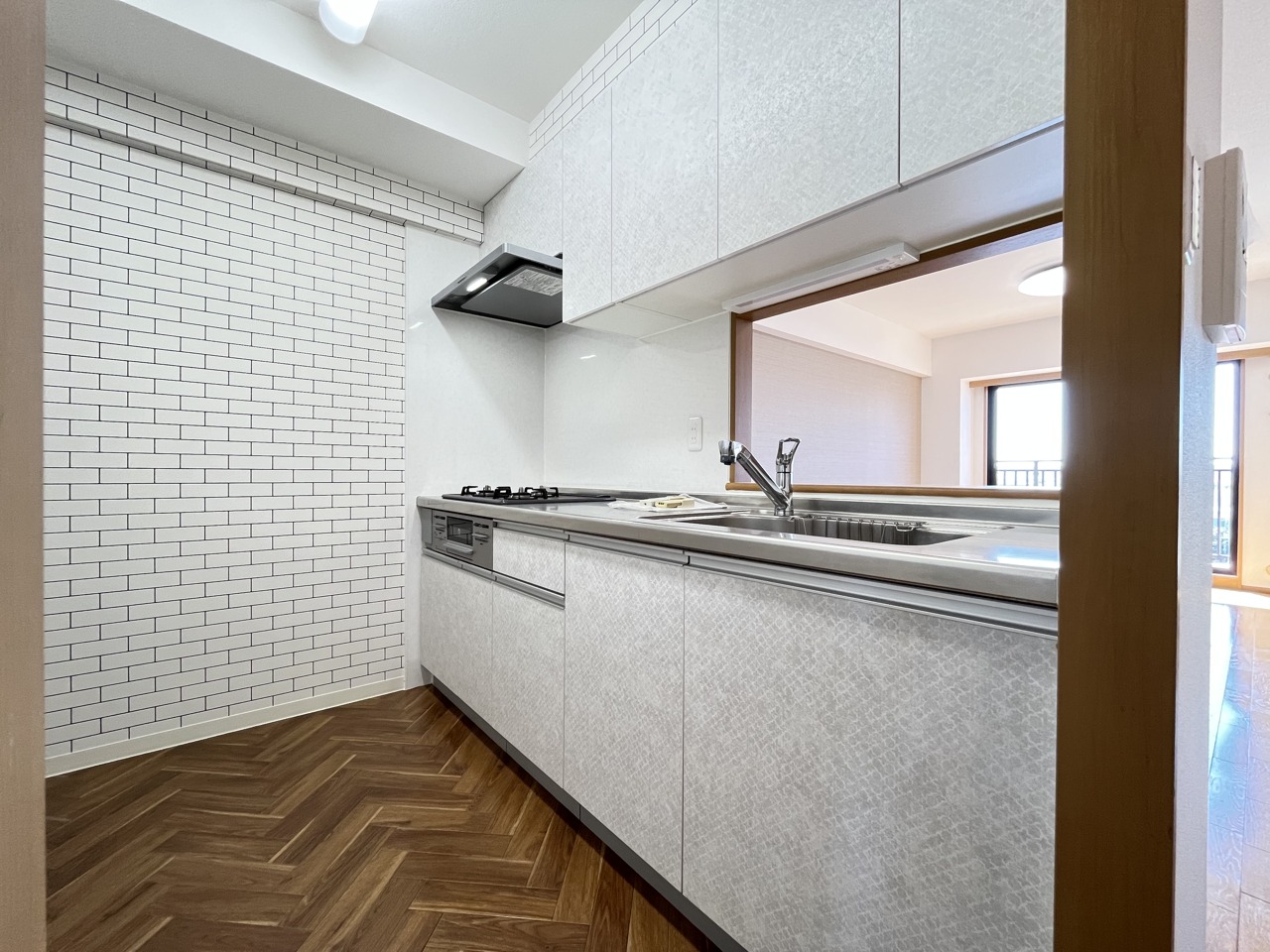 リビングにいる家族の顔が見渡せるカウンターキッチン。お料理もより一層おいしく、楽しく。食器棚を背面に設置しても十分な広さを確保しています。