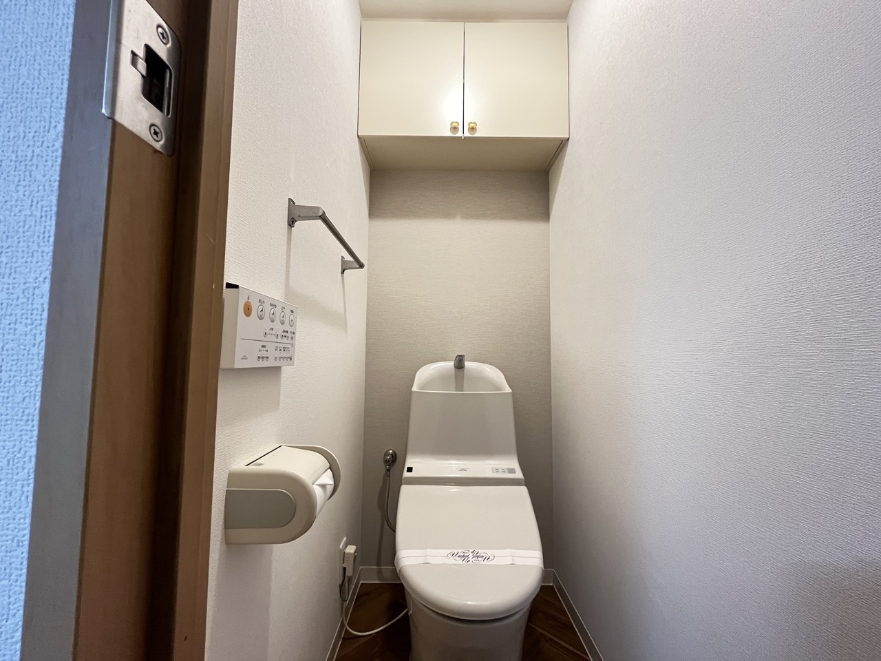 ウォシュレット機能付きのトイレ。収納もあり実用性も兼ね備えた造り。