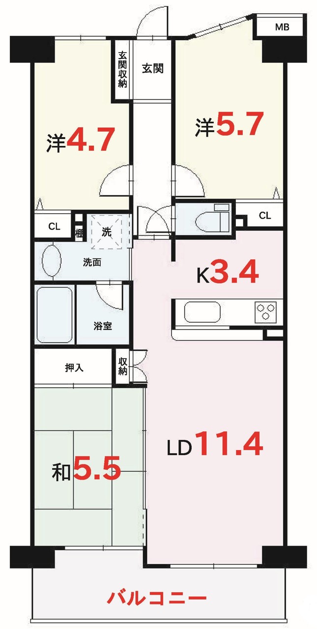 | 間取 | 3LDK (LDK14.8帖、洋室5.7帖、洋室4.7帖、和室5.5帖) | ||