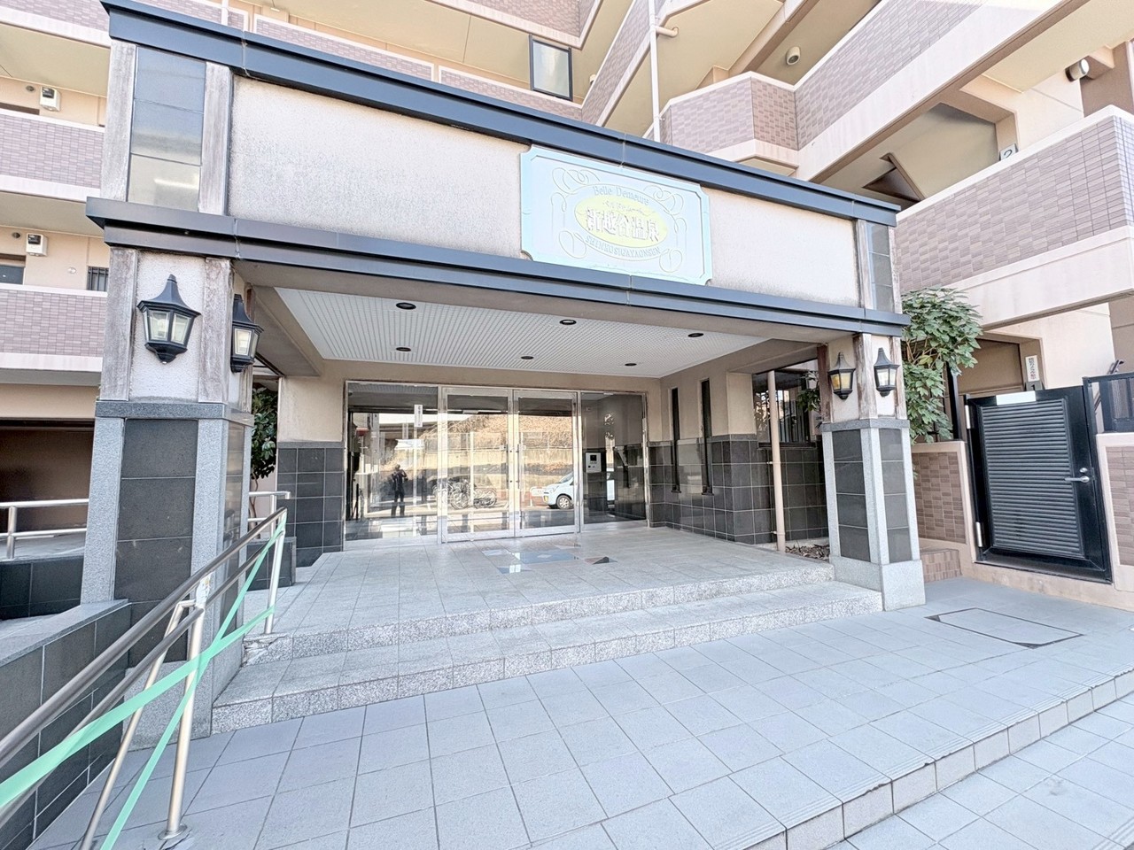 緑豊かな低層マンション、穏やかな日差しが心地よいエントランス。