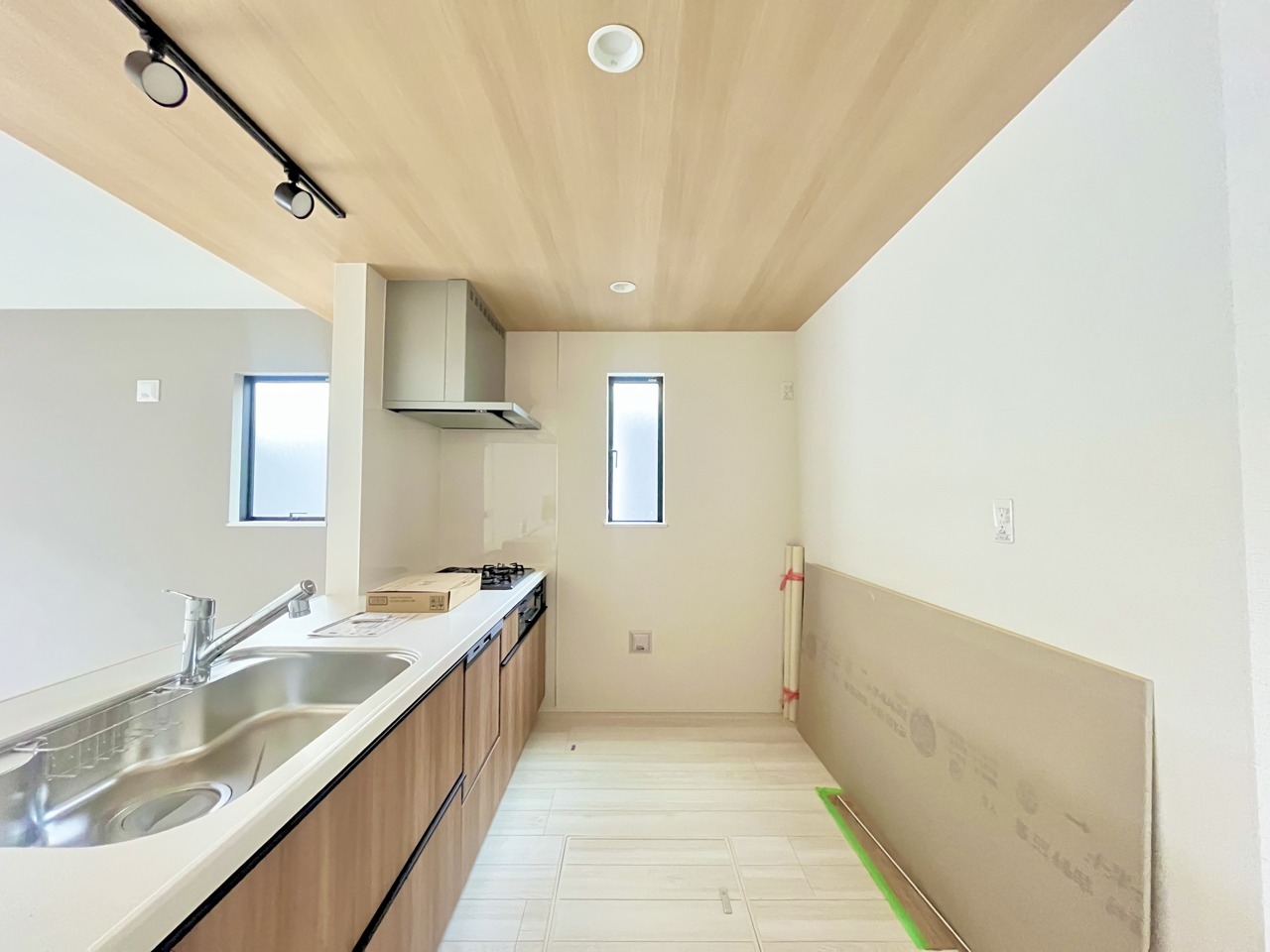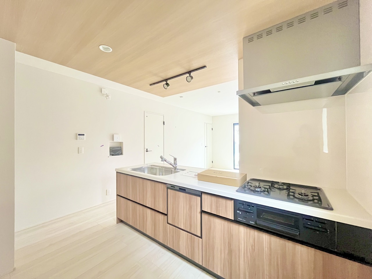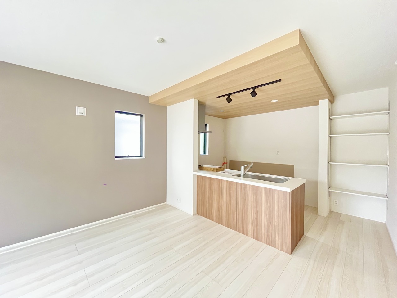 リビングにいる家族の顔が見渡せるカウンターキッチン。お料理もより一層おいしく、楽しく。食器棚を背面に設置しても十分な広さを確保しています。