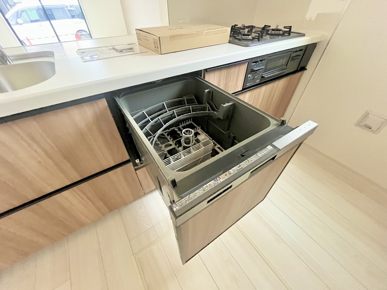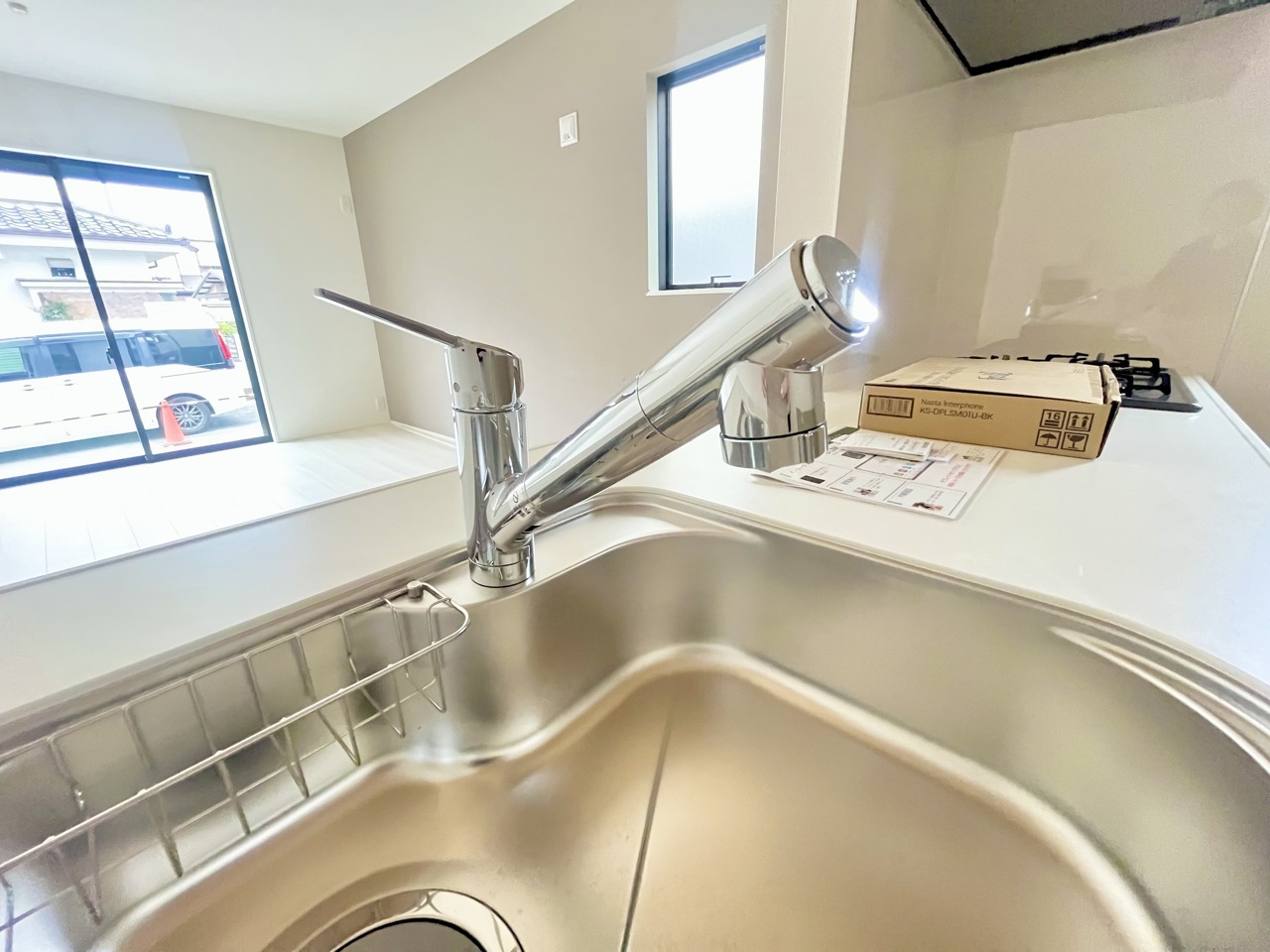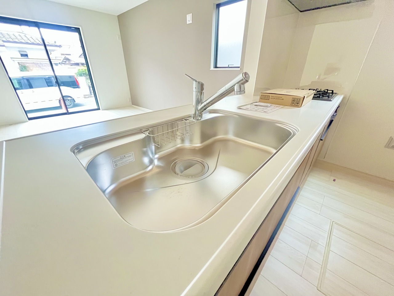 リビングにいる家族の顔が見渡せるカウンターキッチン。お料理もより一層おいしく、楽しく。食器棚を背面に設置しても十分な広さを確保しています。