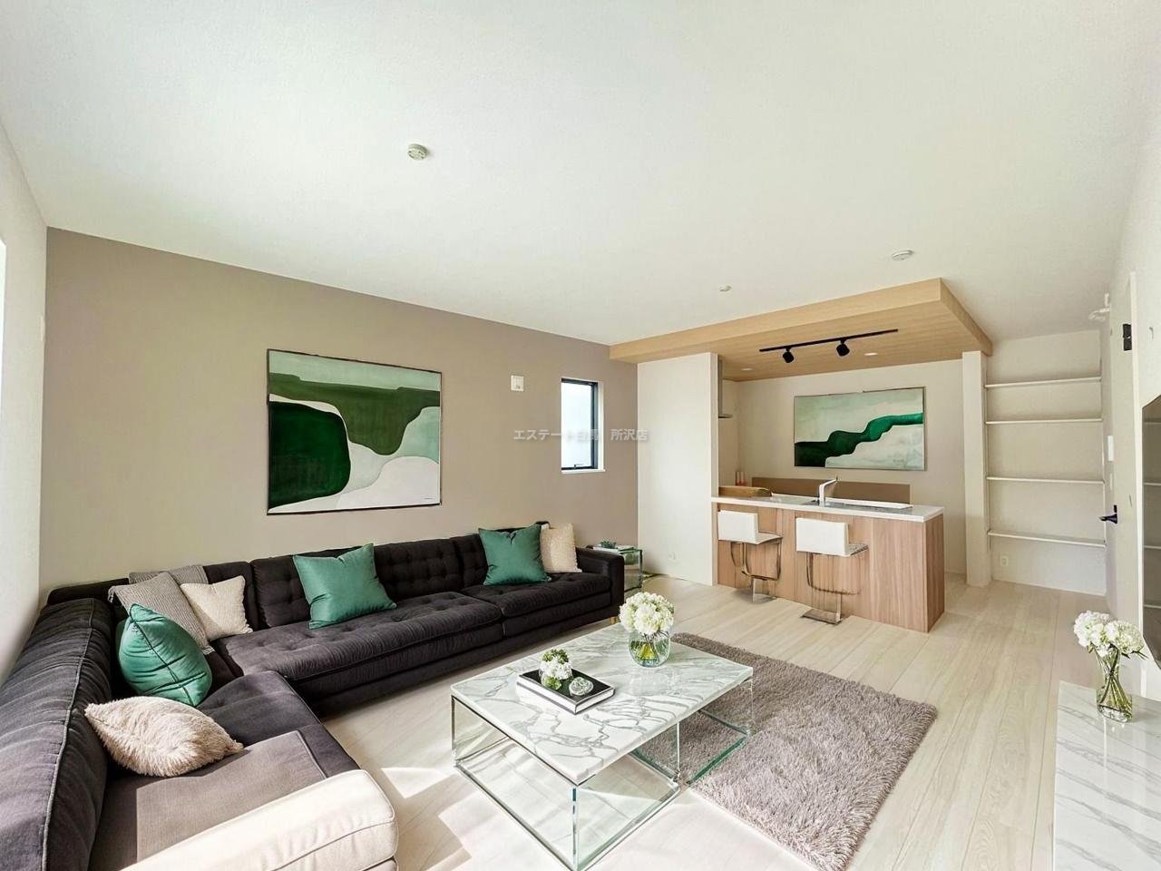 家族や友人、両親、親戚とこれから沢山の時間を紡ぐのだろう。そこを彩るのは窓から見える青い空、心地よい緑。そんなイメージが膨らむリビングスペース。