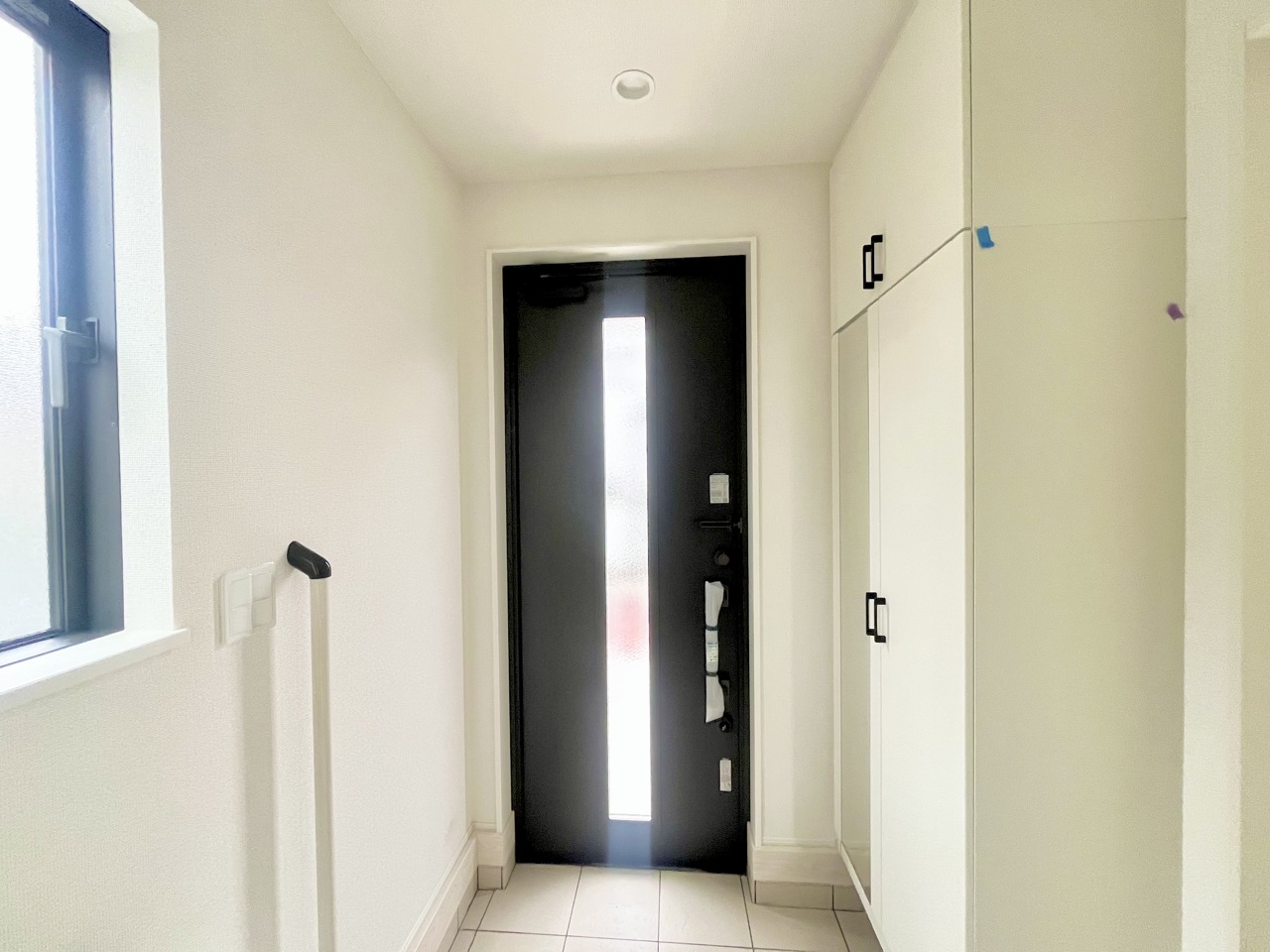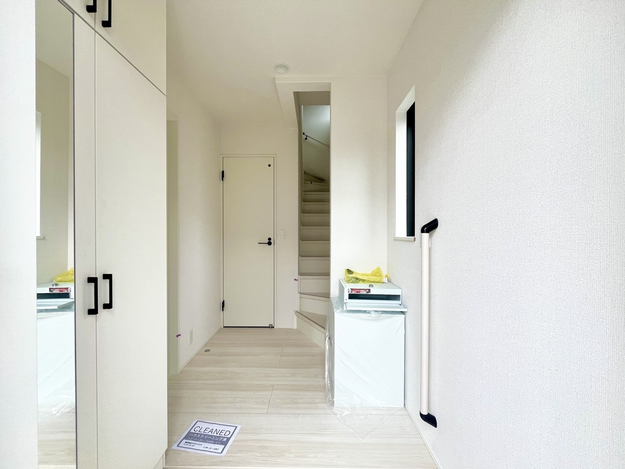お宅の顔となる明るく開放的な玄関。ご家族皆様様の靴を収納できるスペースと全身鏡があり、お出掛け前に身だしなみチェックもできます。