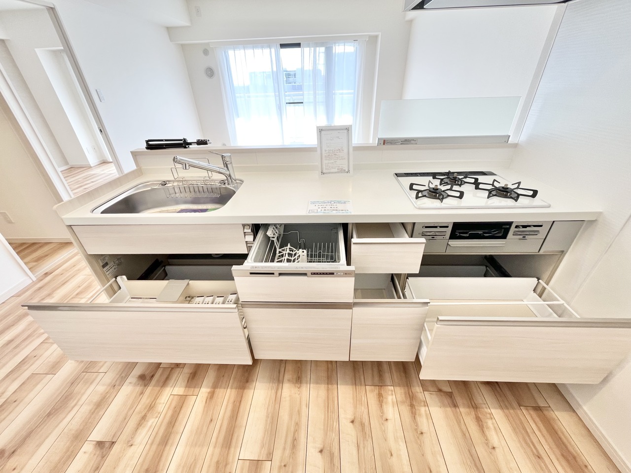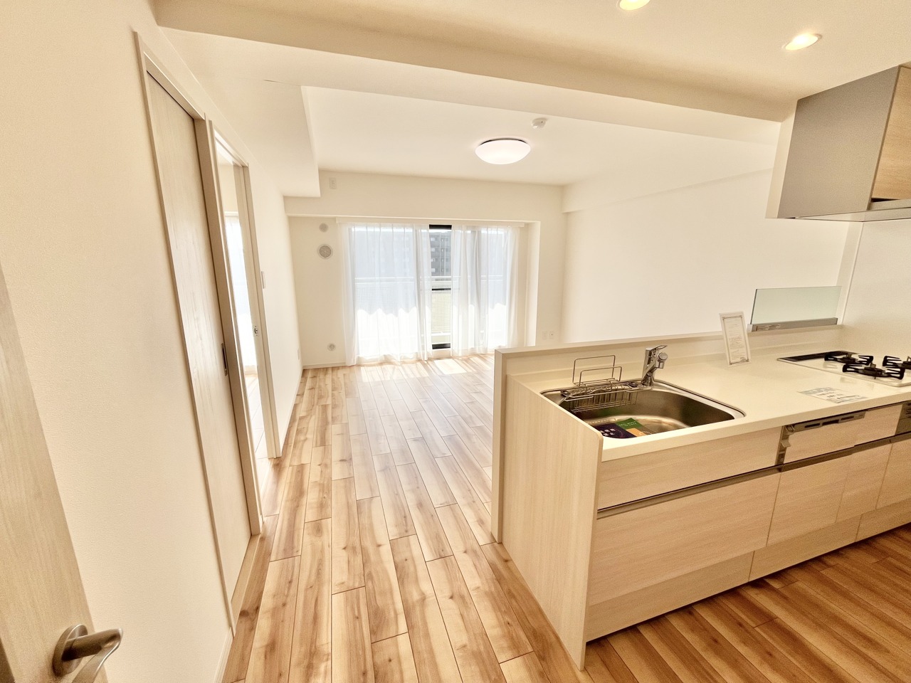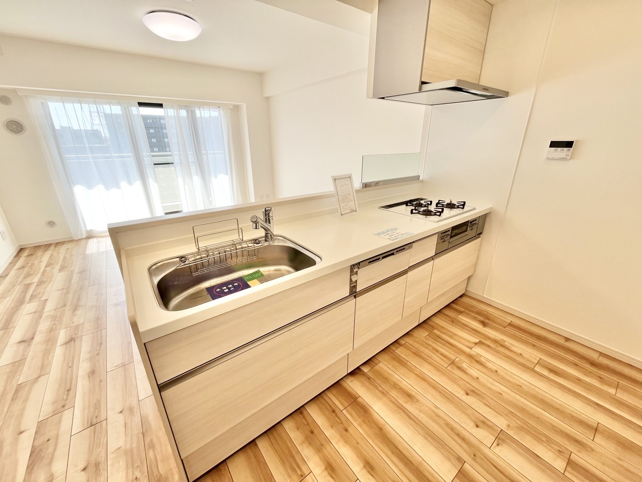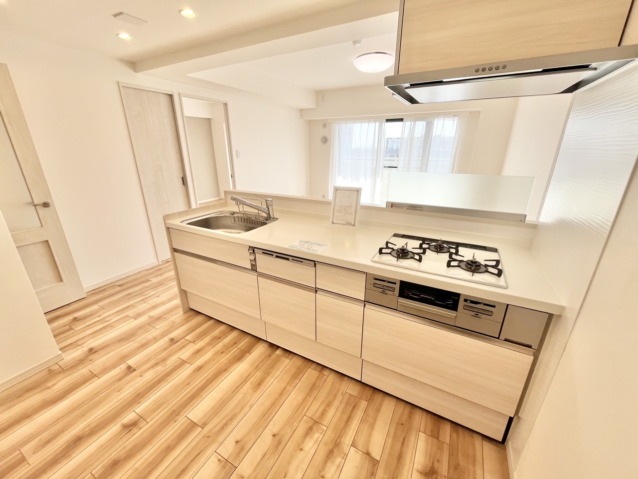 明るい木目調の床と清潔感のあるキッチン空間