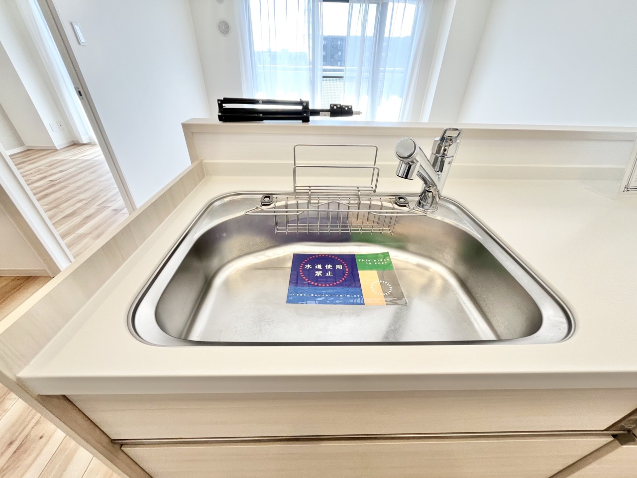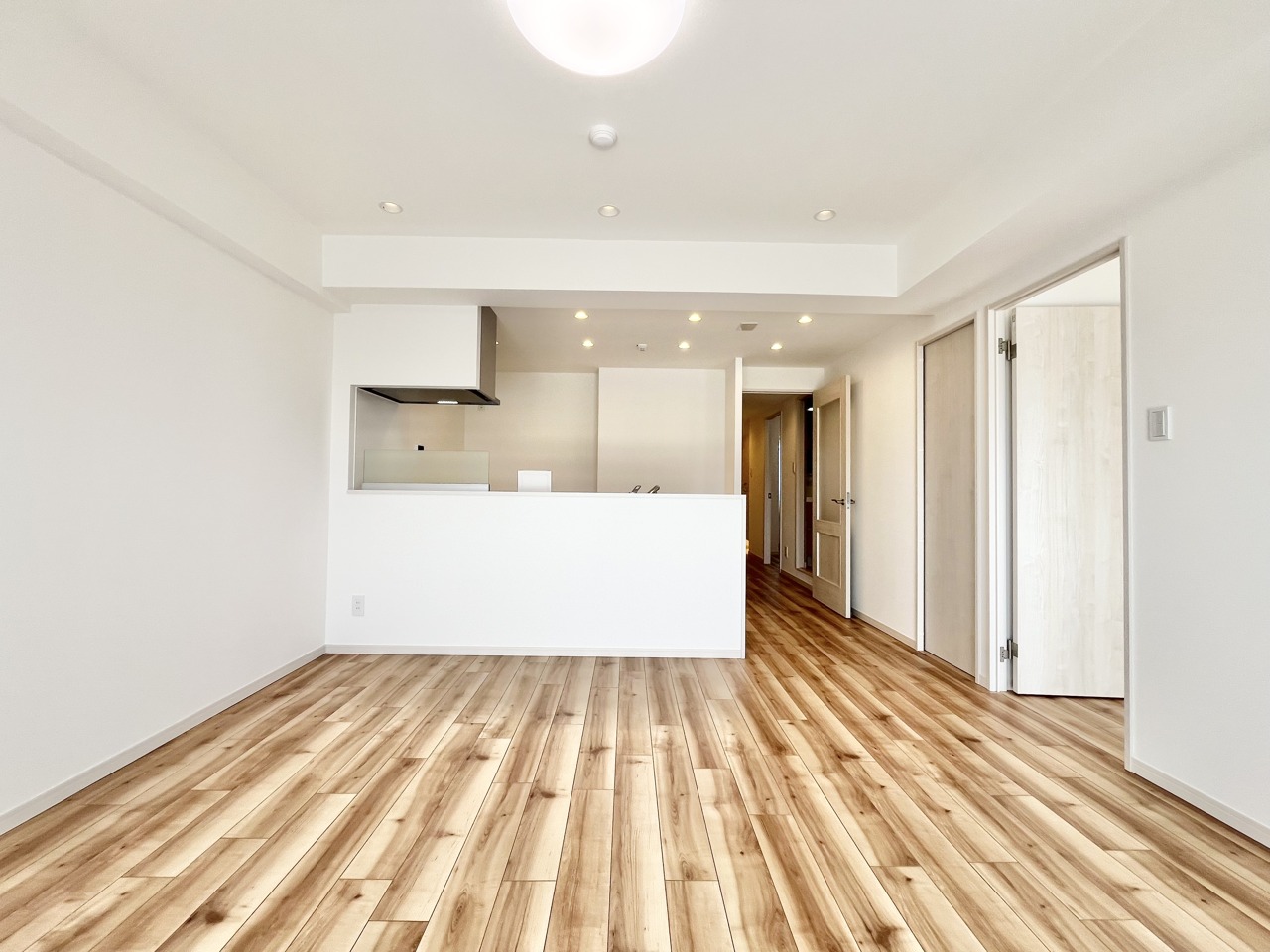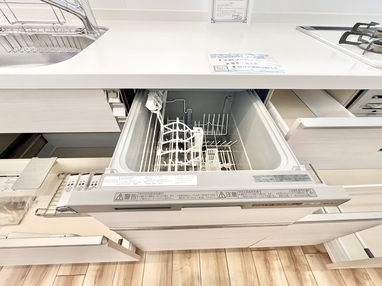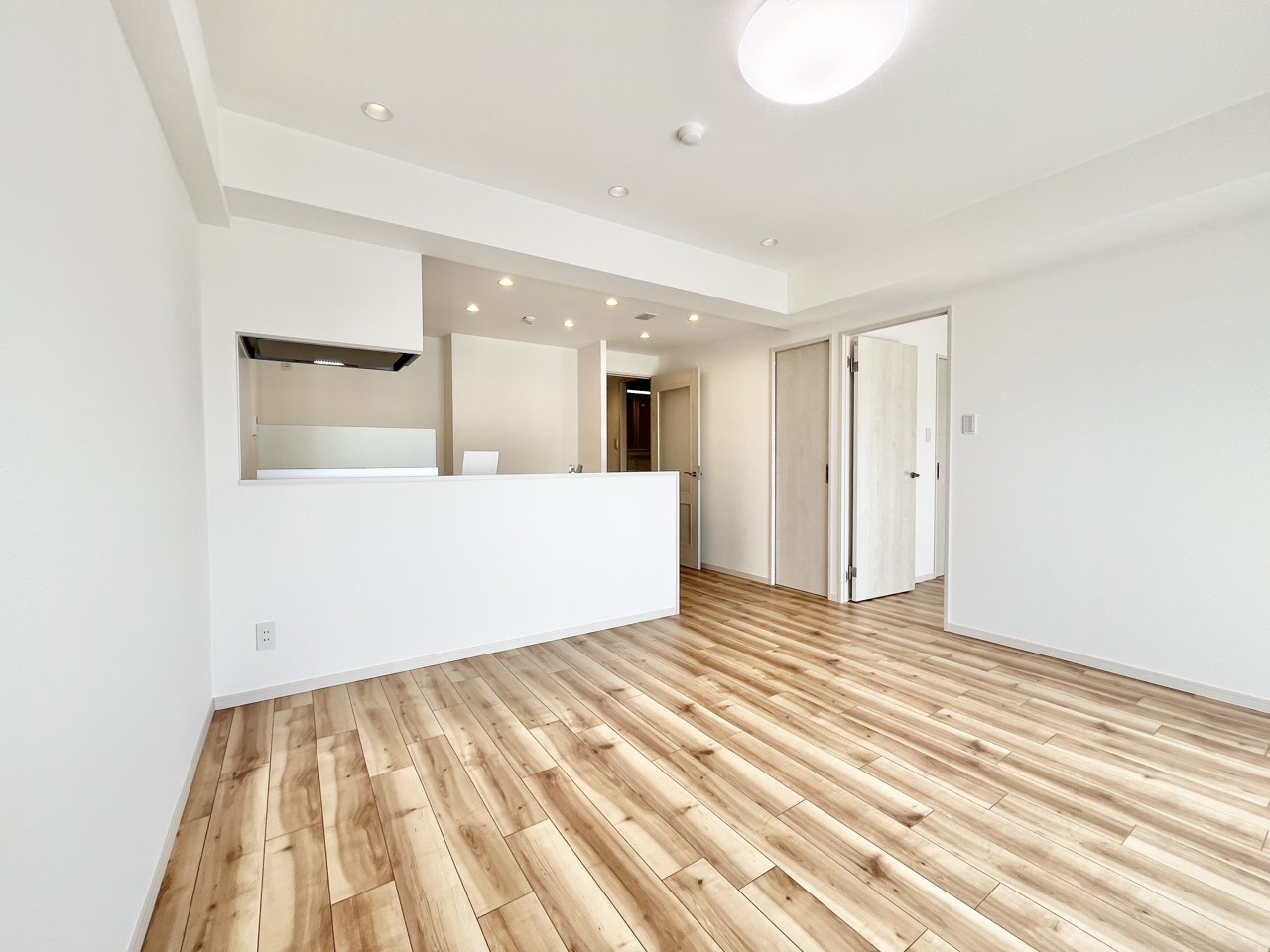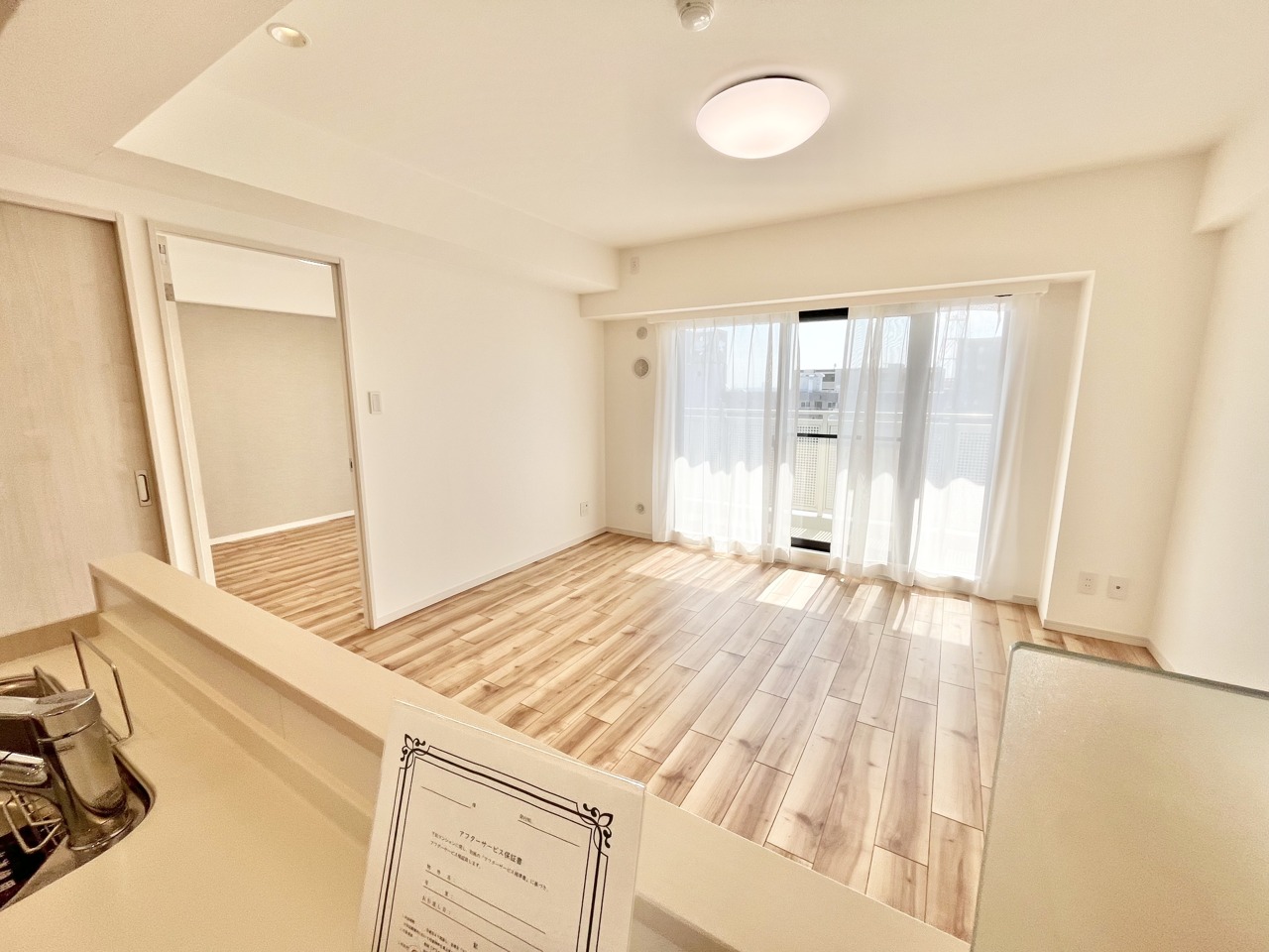 明るい木目調の床と清潔感のあるキッチン空間