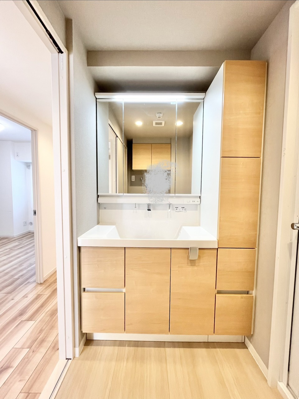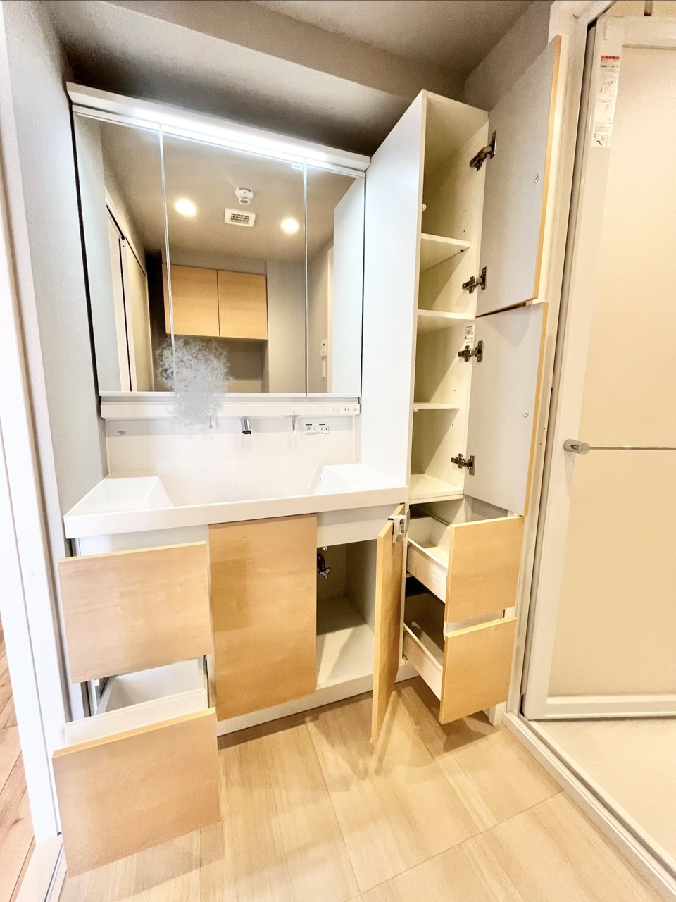 洗面台にはたくさんの収納があり、小物もたくさん入り嬉しいスペースです。