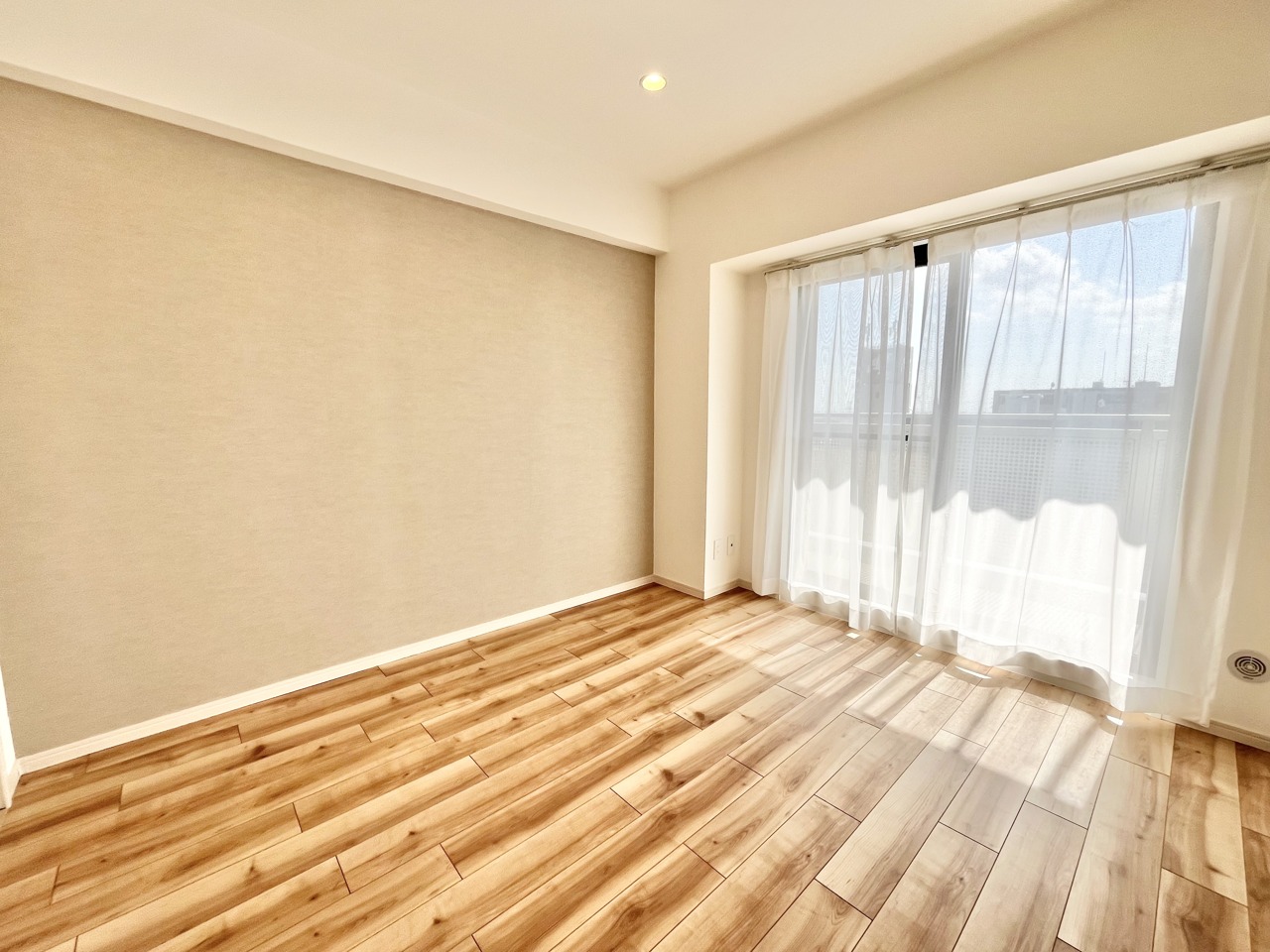 温もりある床材と柔らかな壁の調和が心地よい空間