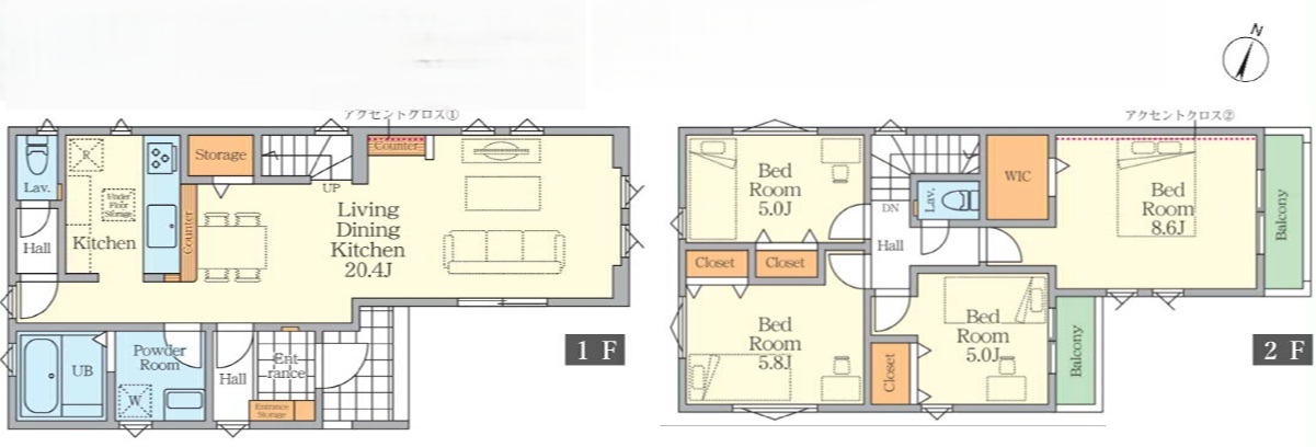 | 間取 | 4LDK+WIC (LDK20.4帖、洋室8.6帖、洋室5.8帖、洋室5.0帖、洋室5.0帖) | ||
