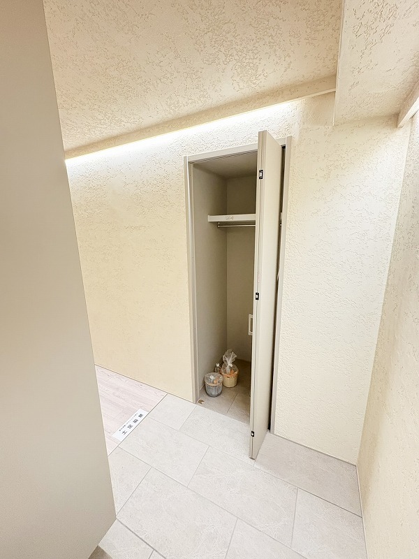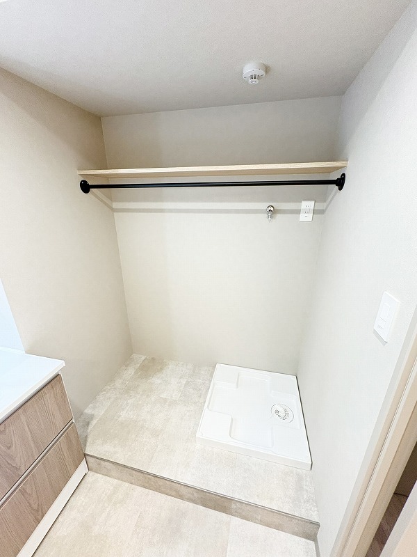 洗濯機置場の横はスペースがある為、棚などを置いて収納スペースにしても良さそうですね。