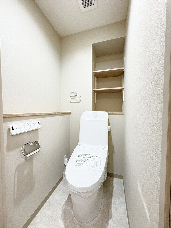 ウォシュレット機能付きのトイレ。換気のしやすい窓付きで、収納もあり実用性も兼ね備えた造り。