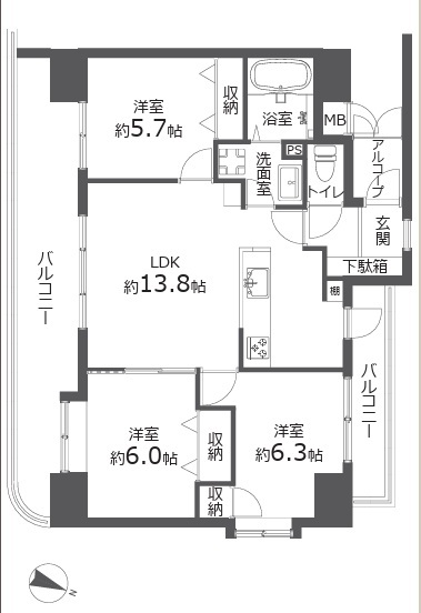 | 間取 | 3LDK (LDK13.8帖、洋室6.3帖、洋室6.0帖、洋室5.7帖) | ||
