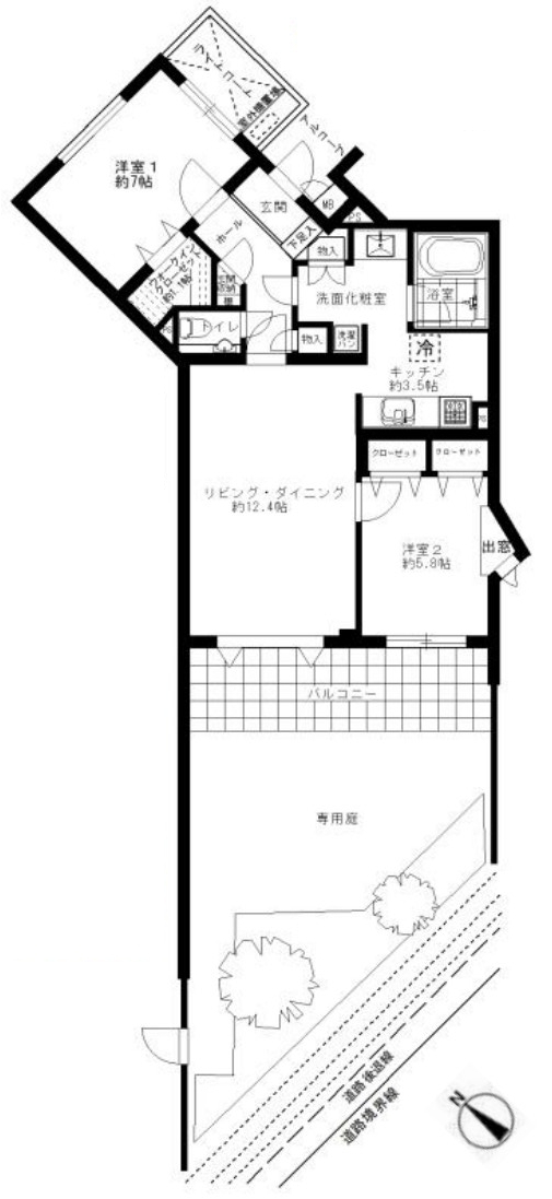 | 間取 | 2LDK (LD12.4帖、K3.5帖、洋室7帖、洋室5.8帖) | ||