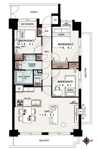 | 間取 | 3LDK (LDK15.5帖、洋室5.5帖、洋室4.4帖、洋室4.2帖) | ||