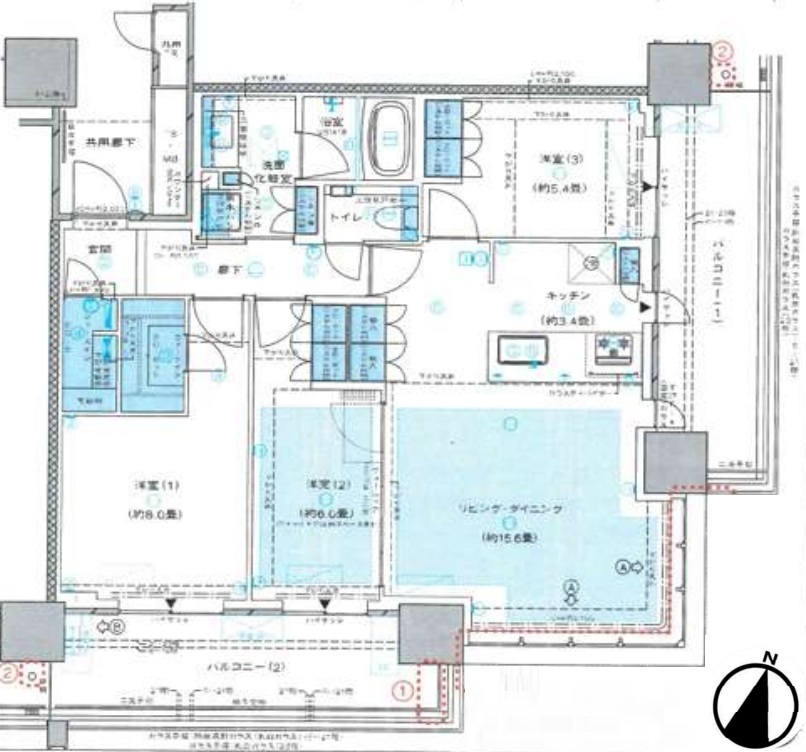 | 間取 | 3LDK (LD15.6帖、K3.4帖、洋室8.0帖、洋室6.0帖、洋室5.4帖) | ||