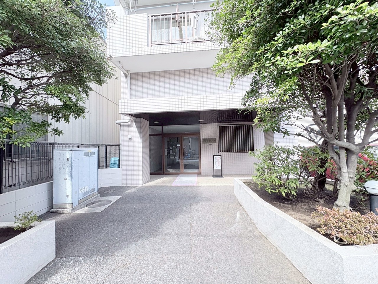 緑豊かな植栽に囲まれ、心地よい風を感じるエントランス