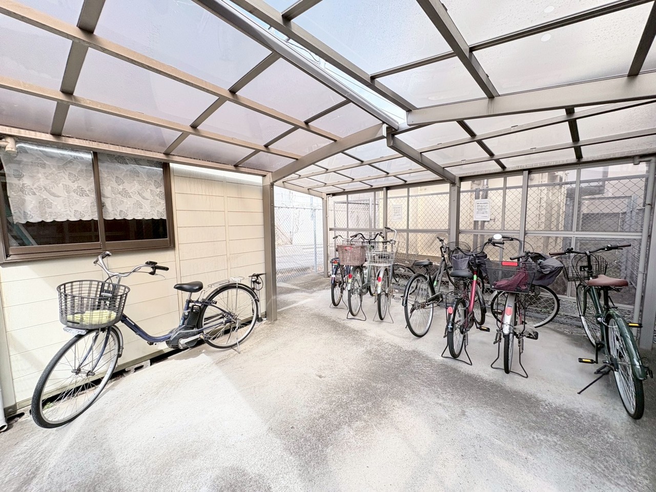 屋根付き駐輪スペースで雨の日も安心、自転車の保管に便利です。