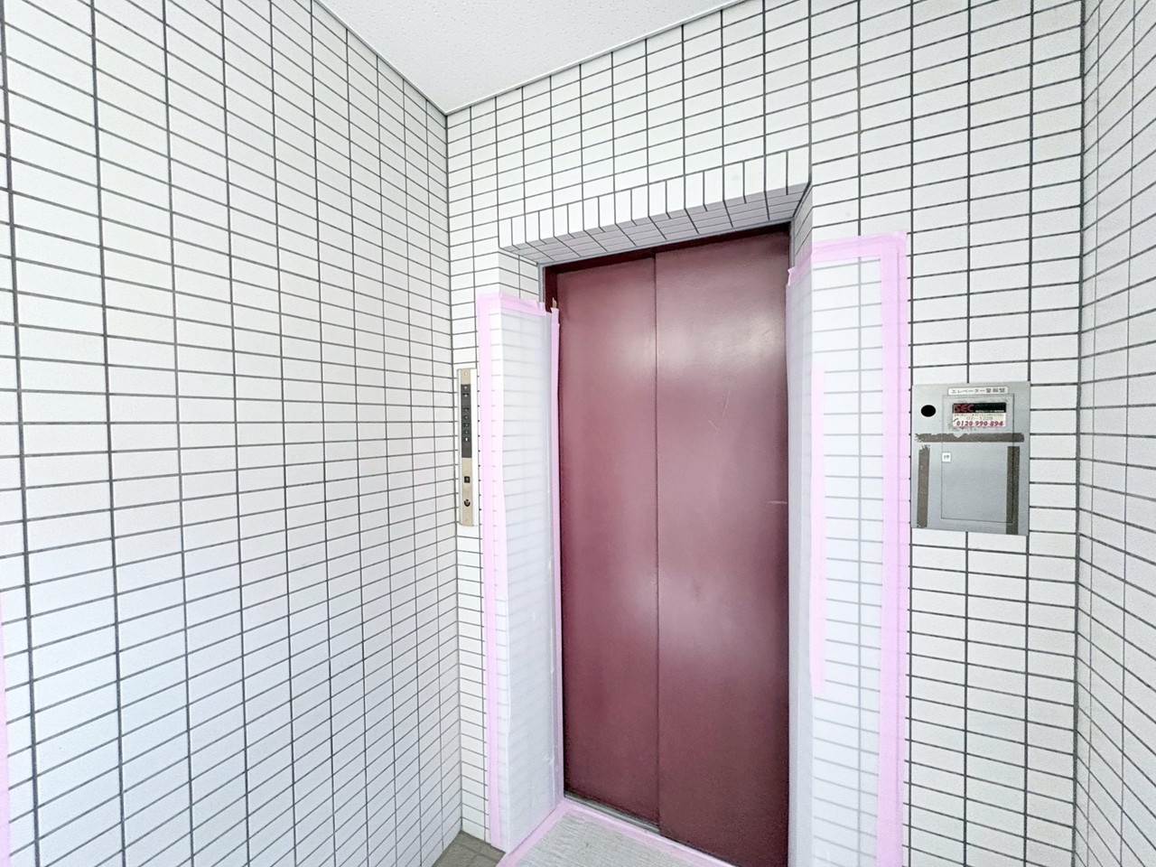 清潔感あふれるタイル張りの空間に、落ち着いた色合いのエレベーターが佇んでいます。