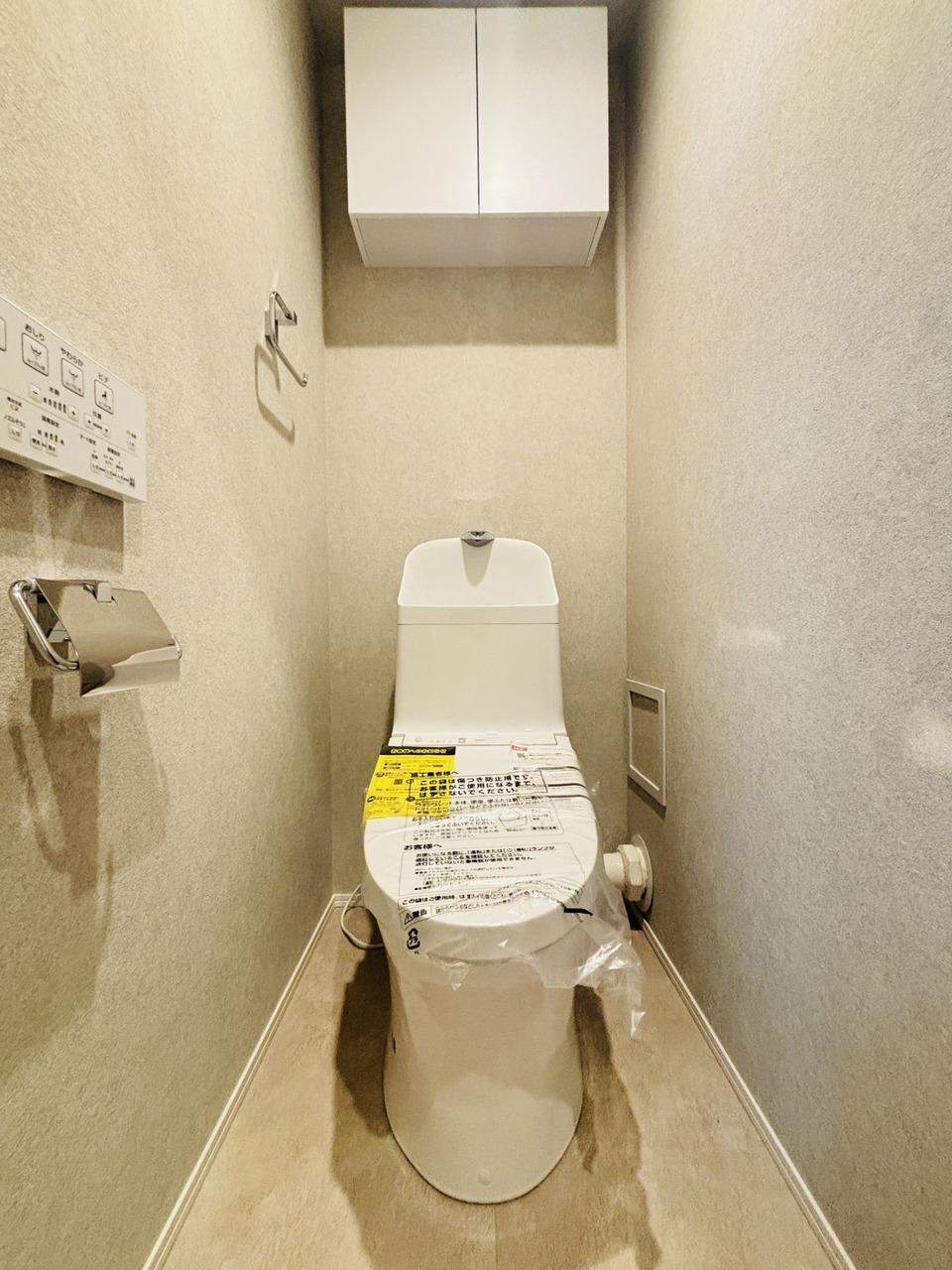 ウォシュレット機能付きのトイレ。収納もあり実用性も兼ね備えた造り。