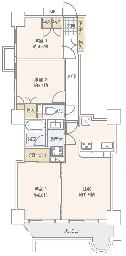 | 間取 | 3LDK (LDK11.5帖、洋室4.8帖、洋室5.1帖、洋室6帖) | ||