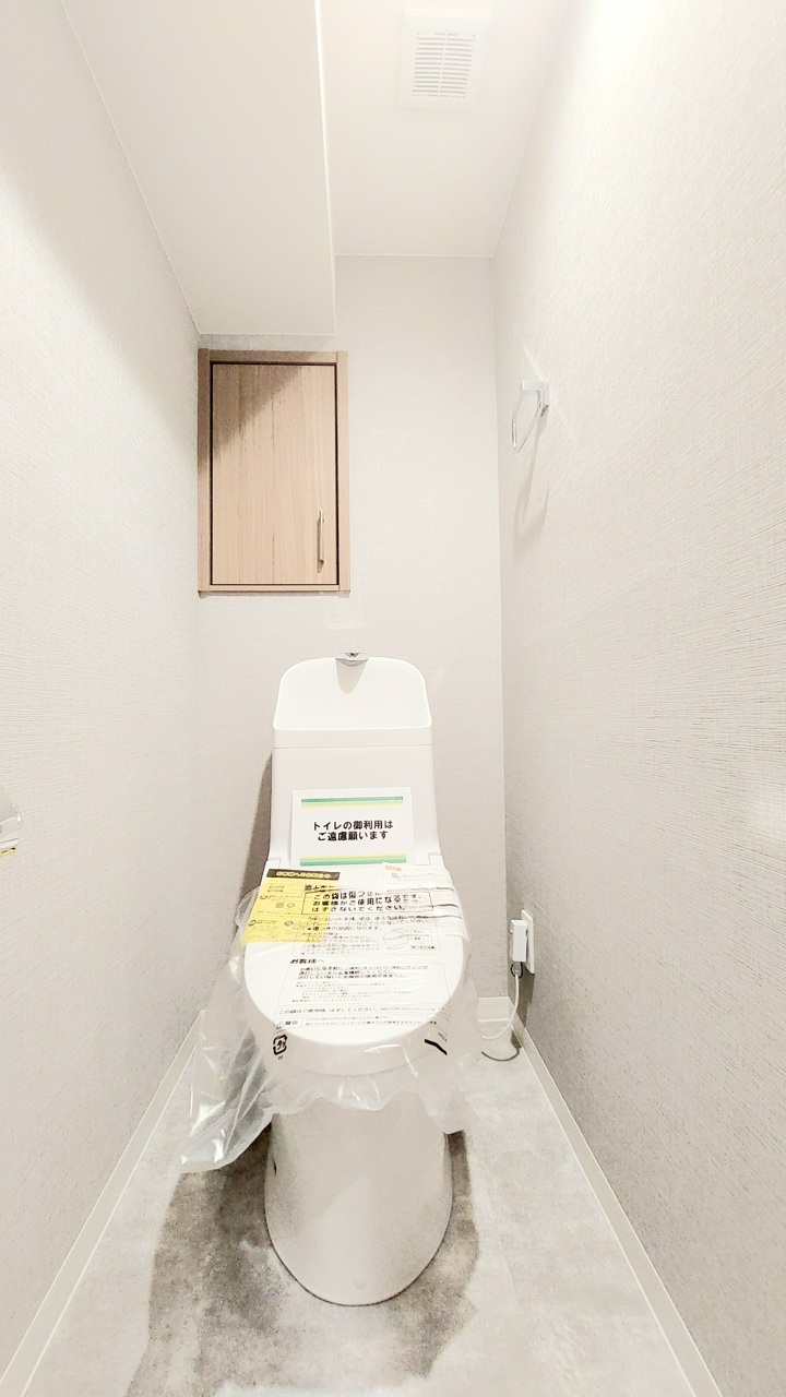 ウォシュレット機能付きのトイレ。収納もあり実用性も兼ね備えた造り。