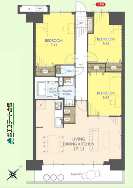 | 間取 | 3LDK (洋室7.4帖、洋室5.5帖、洋室5.3帖、LDK17.1帖) | ||