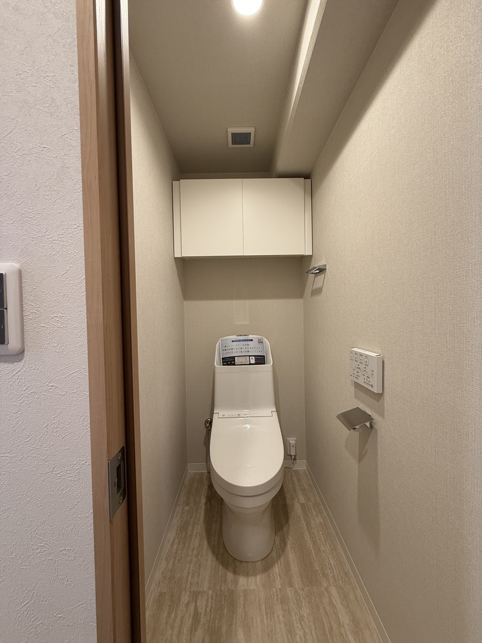 ウォシュレット機能付きのトイレ。収納もあり実用性も兼ね備えた造り。
