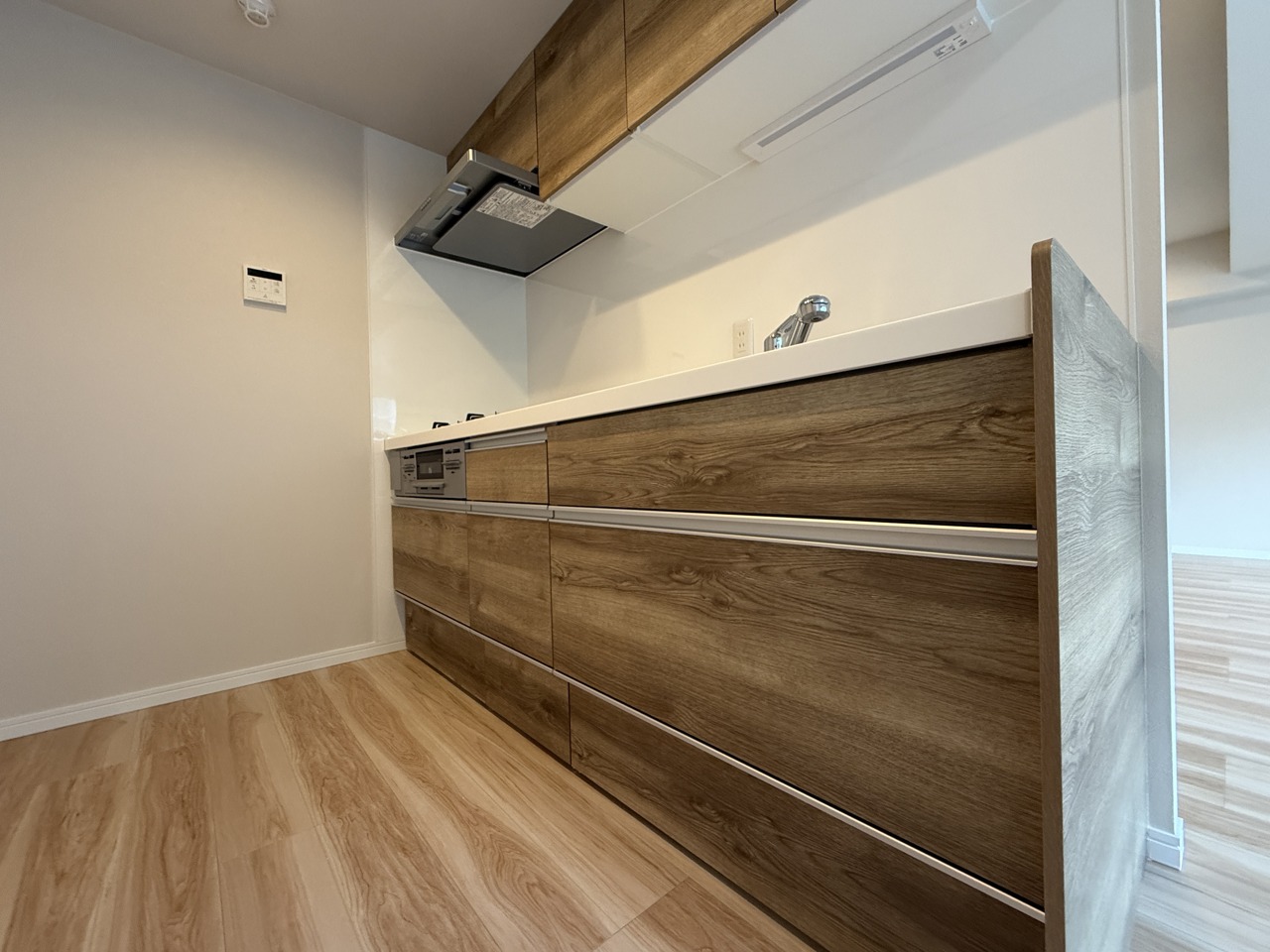 人工大理石を使用したシステムキッチン。永く傷つきにくく、お手入れもしやすい高機能性です。
