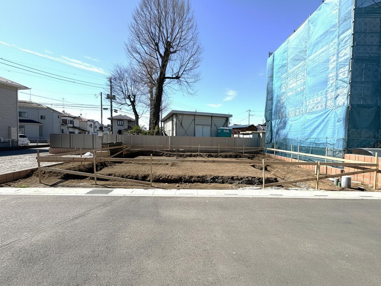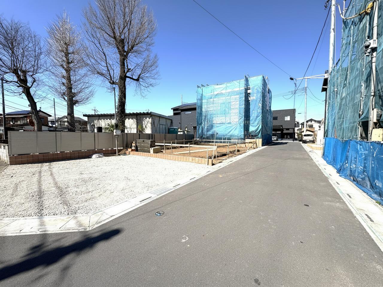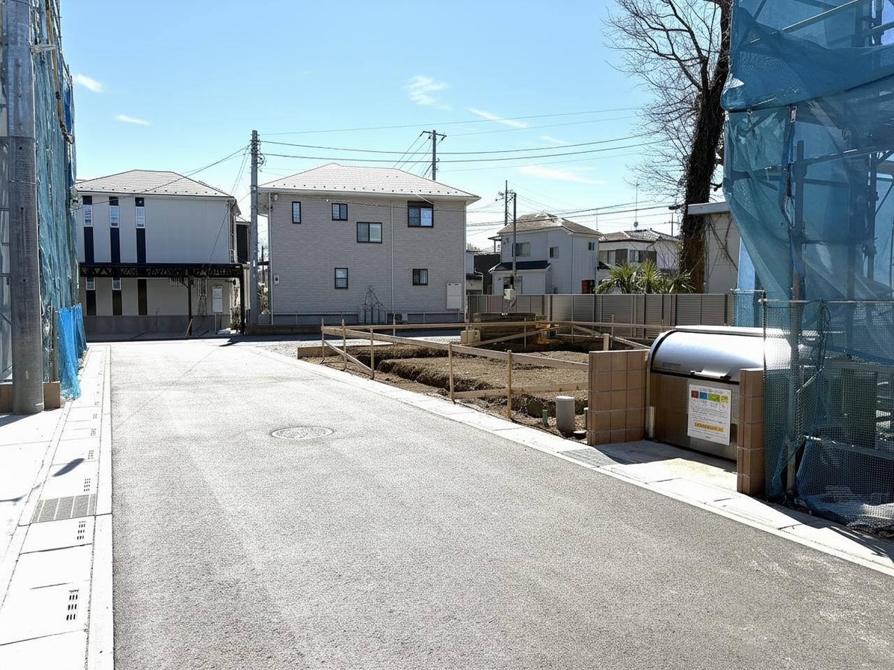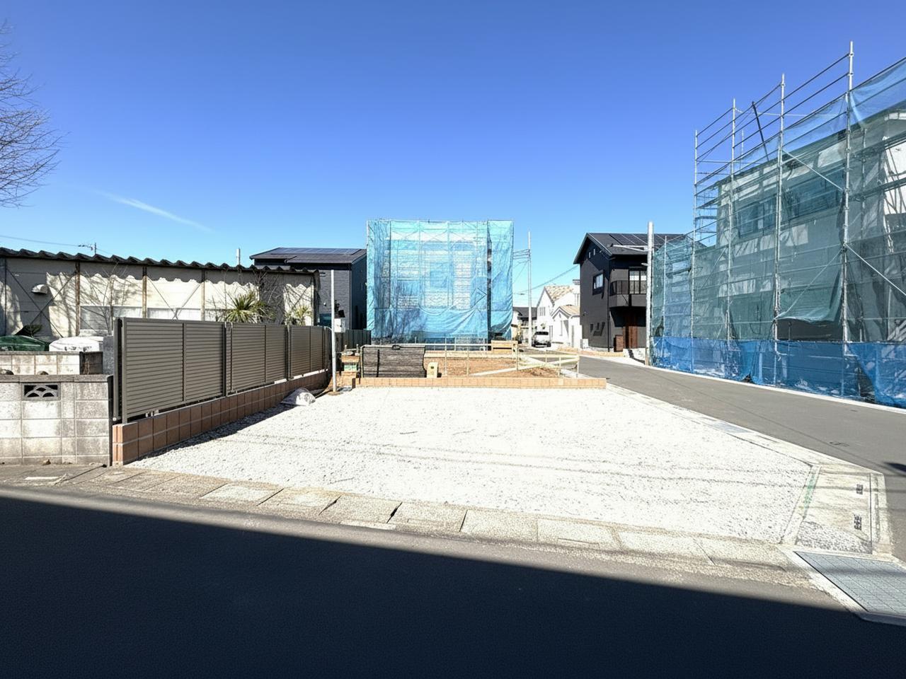 青空の下、整地された土地が広がる、穏やかな日差しを感じる街並み
