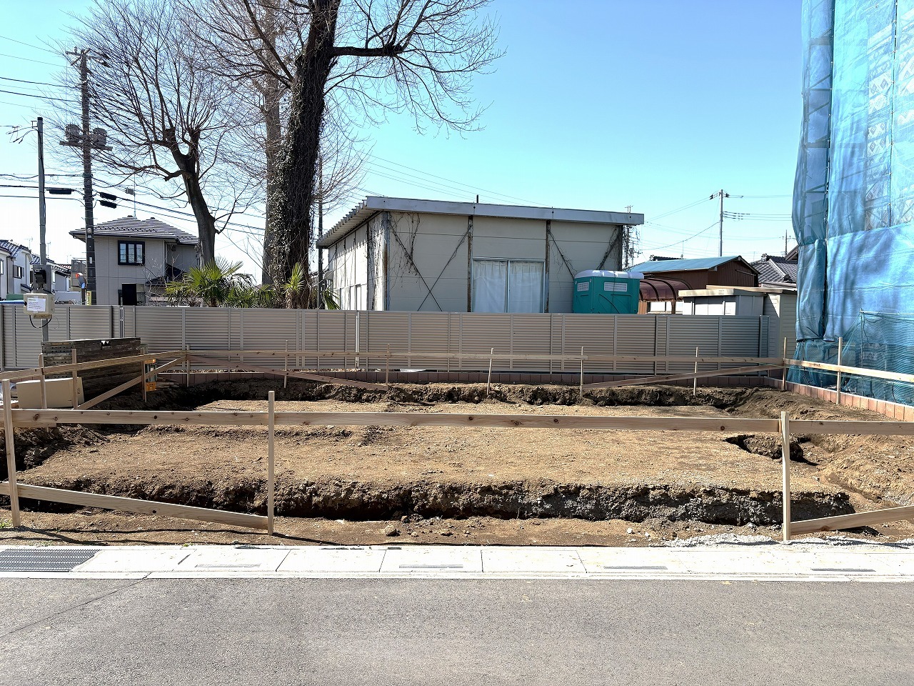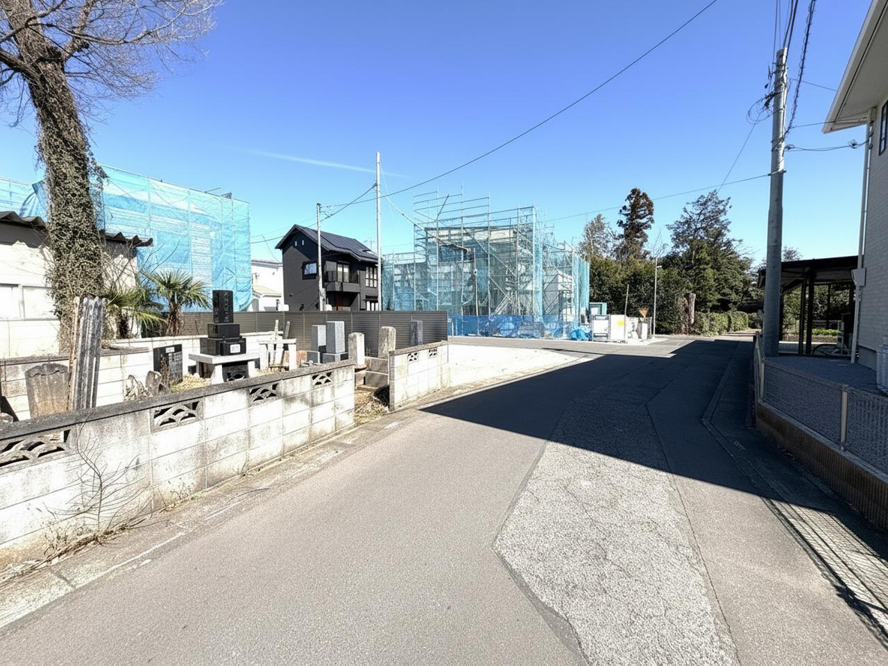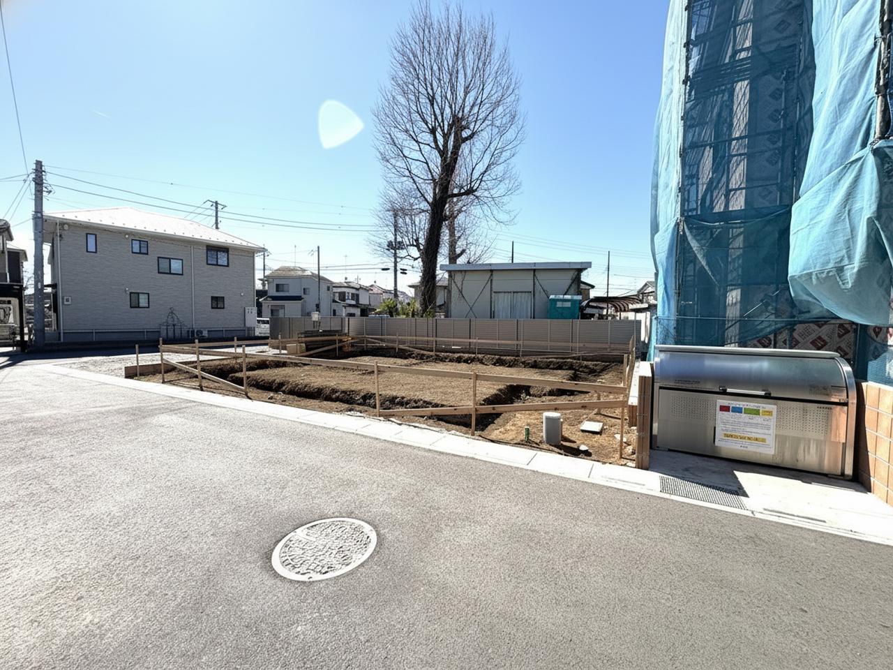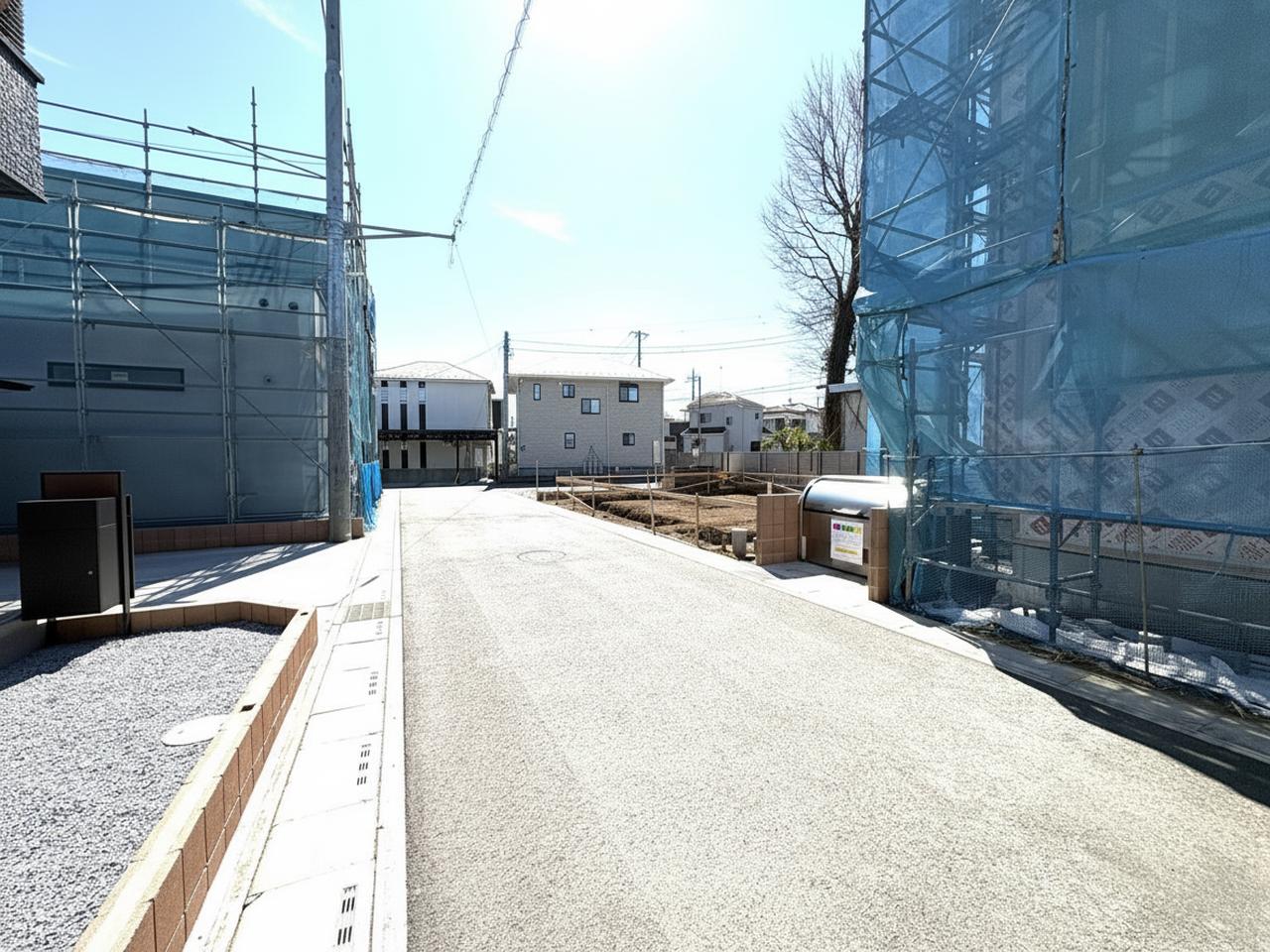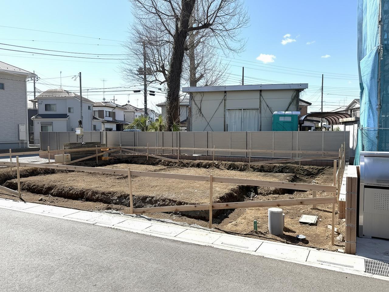 青空の下、整地された土地が広がる、穏やかな日差しを感じる街並み