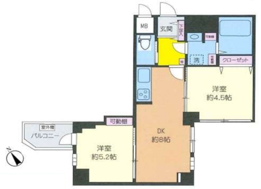 | 間取 | 2DK (DK8.0帖、洋室5.2帖、洋室4.5帖) | ||