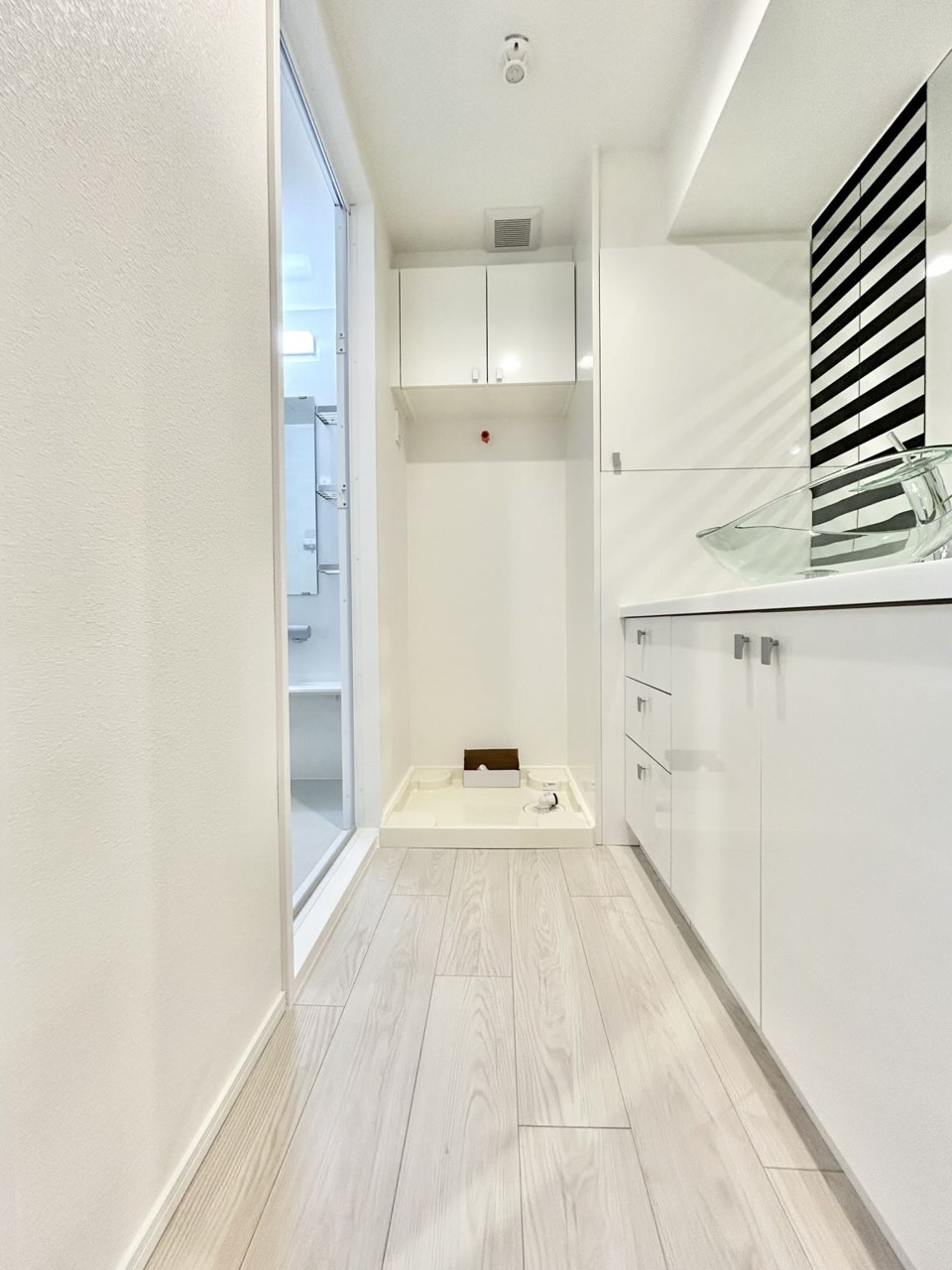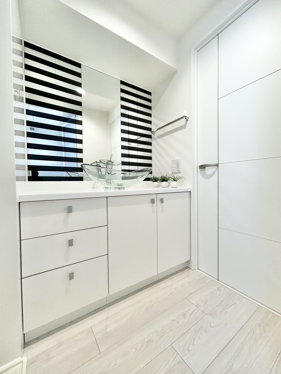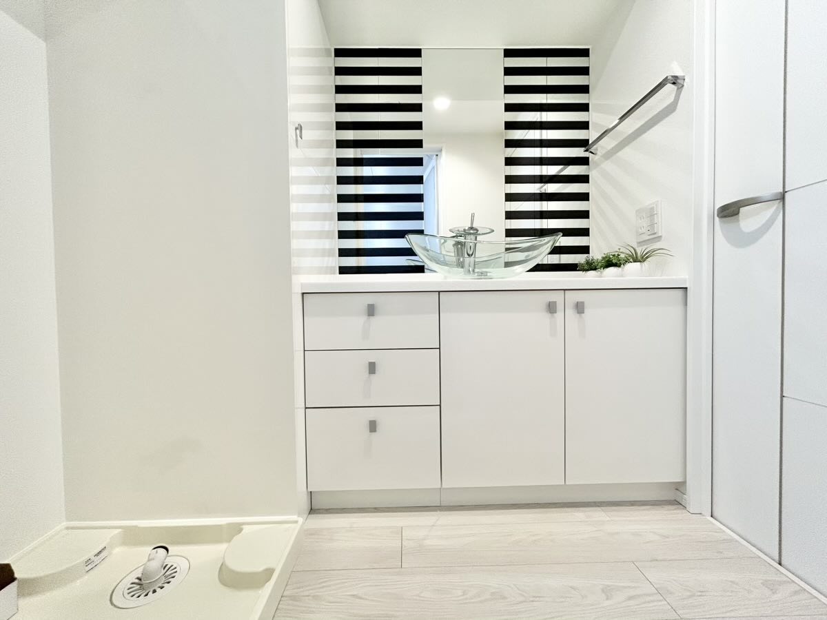 洗面化粧台は清潔感の漂うホワイトをベースカラーに、シンプルなデザインで。