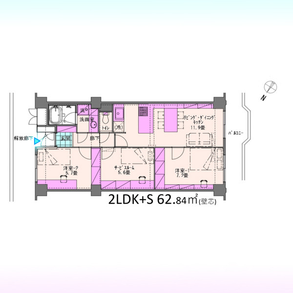 | 間取 | 2SLDK (LDK11.9帖、洋室7.2帖、洋室5.7帖、S5.6帖) | ||