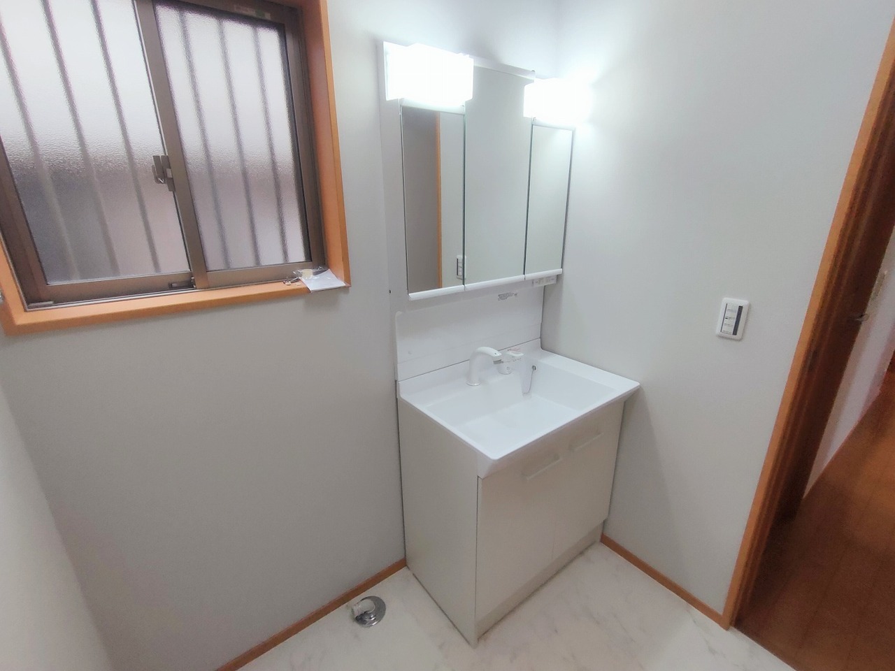 三面鏡を採用した洗面化粧台。鏡の裏にも収納スペースがあります。