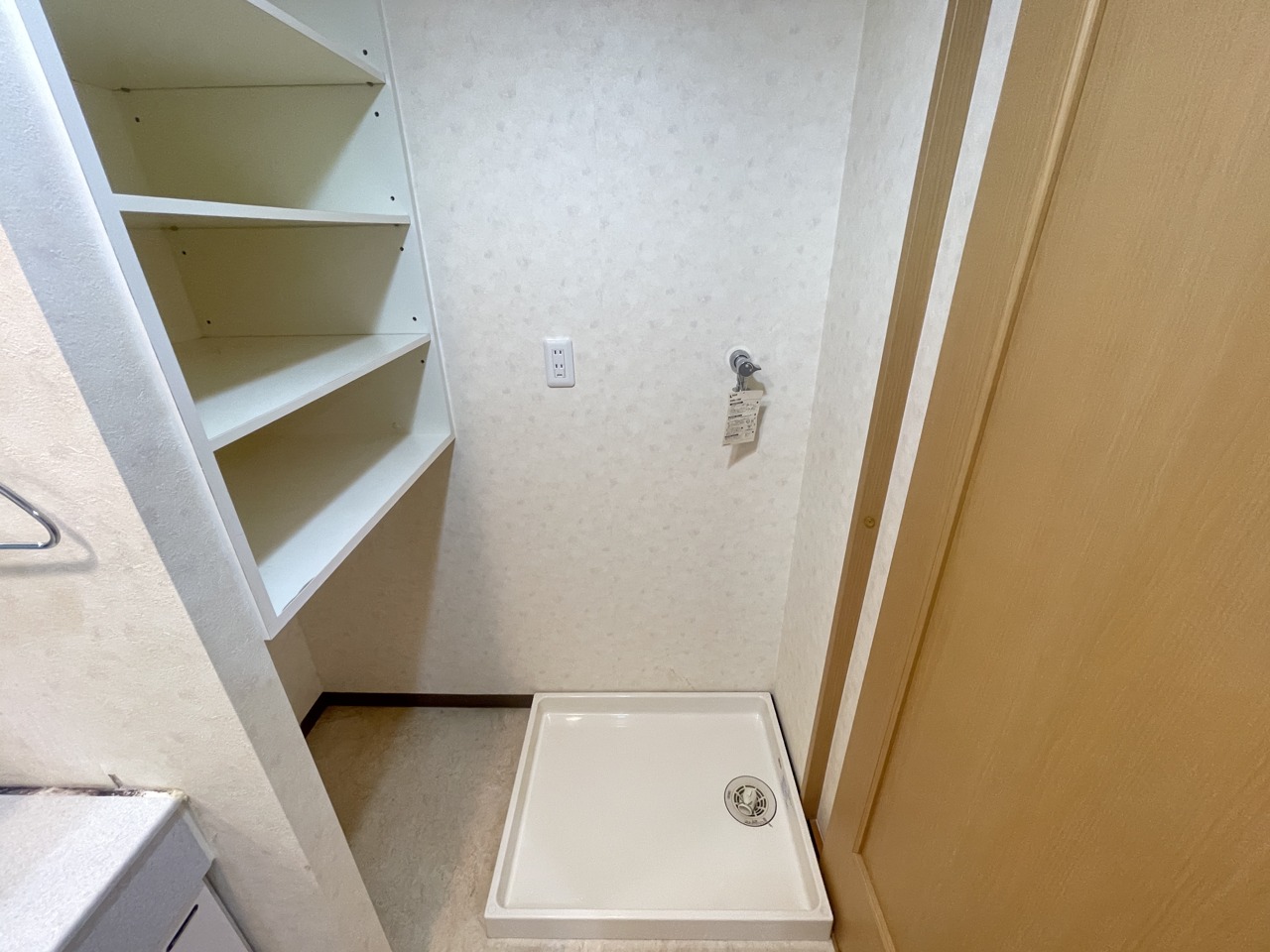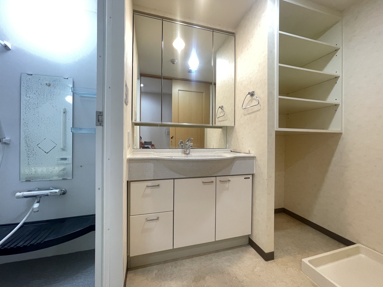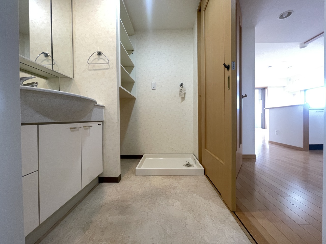 洗面台横にランドリーコーナーもゆったり。ドラム式洗濯機も置けそう。