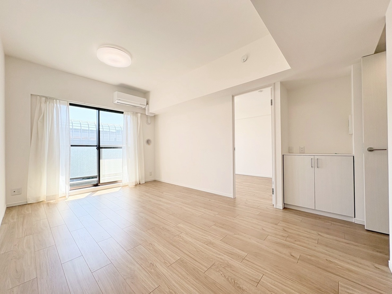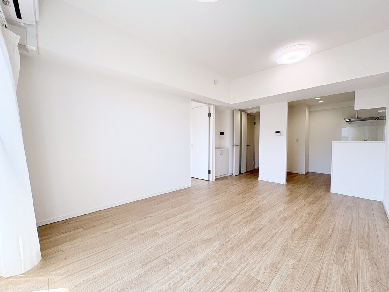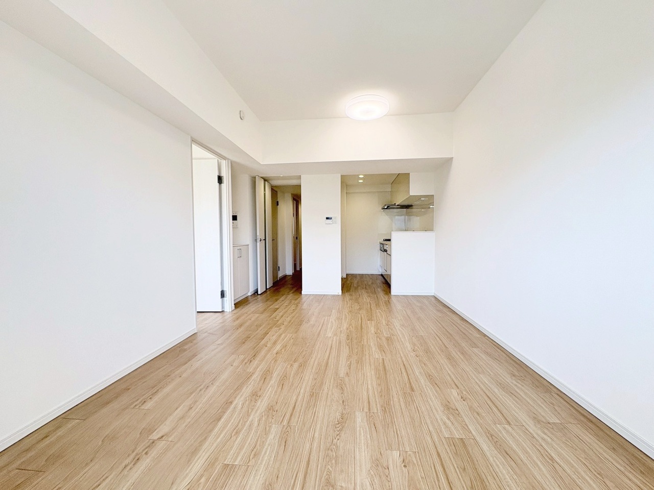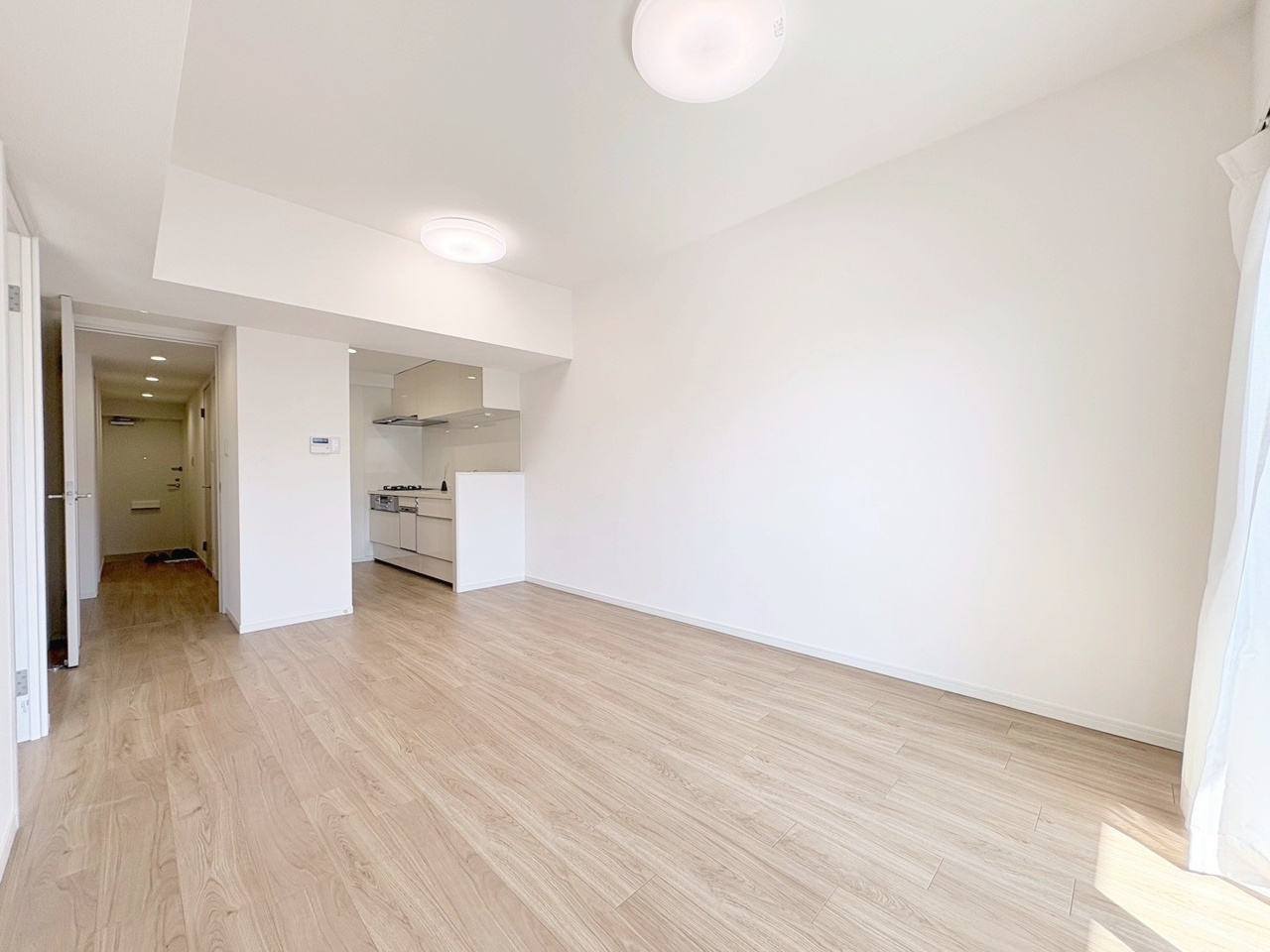 穏やかな木目調の床と白で統一された、心地よく広がる空間。