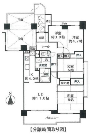 | 間取 | 4LDK + 分譲当時間取(スケルトン状態で引渡) (LD11.0帖、K4.0帖、和室8.0帖、和室6.0帖、洋室4.7帖、洋室3.9帖) | ||