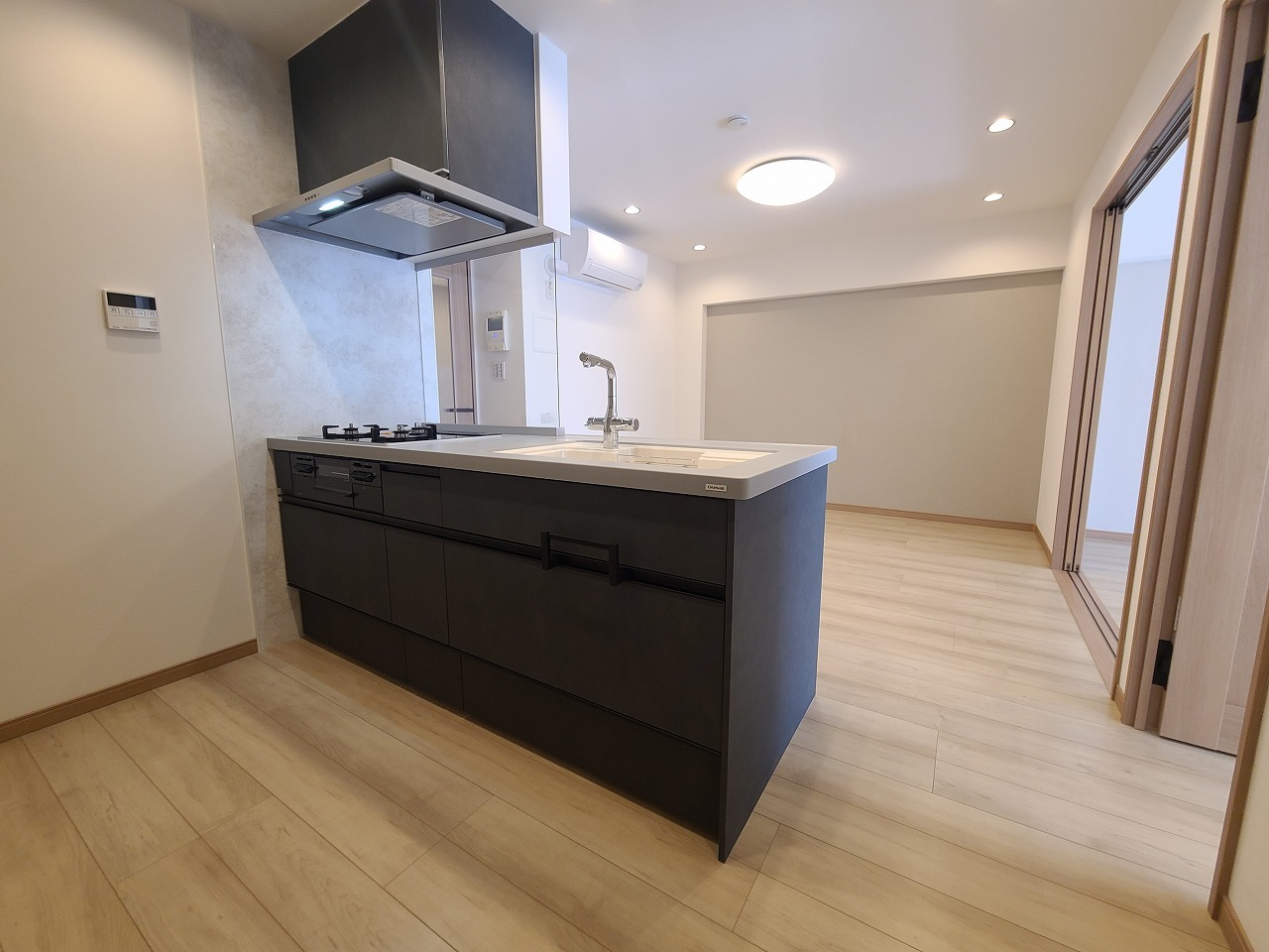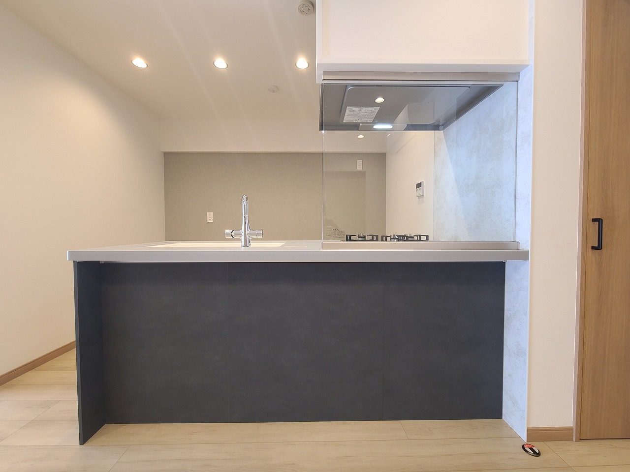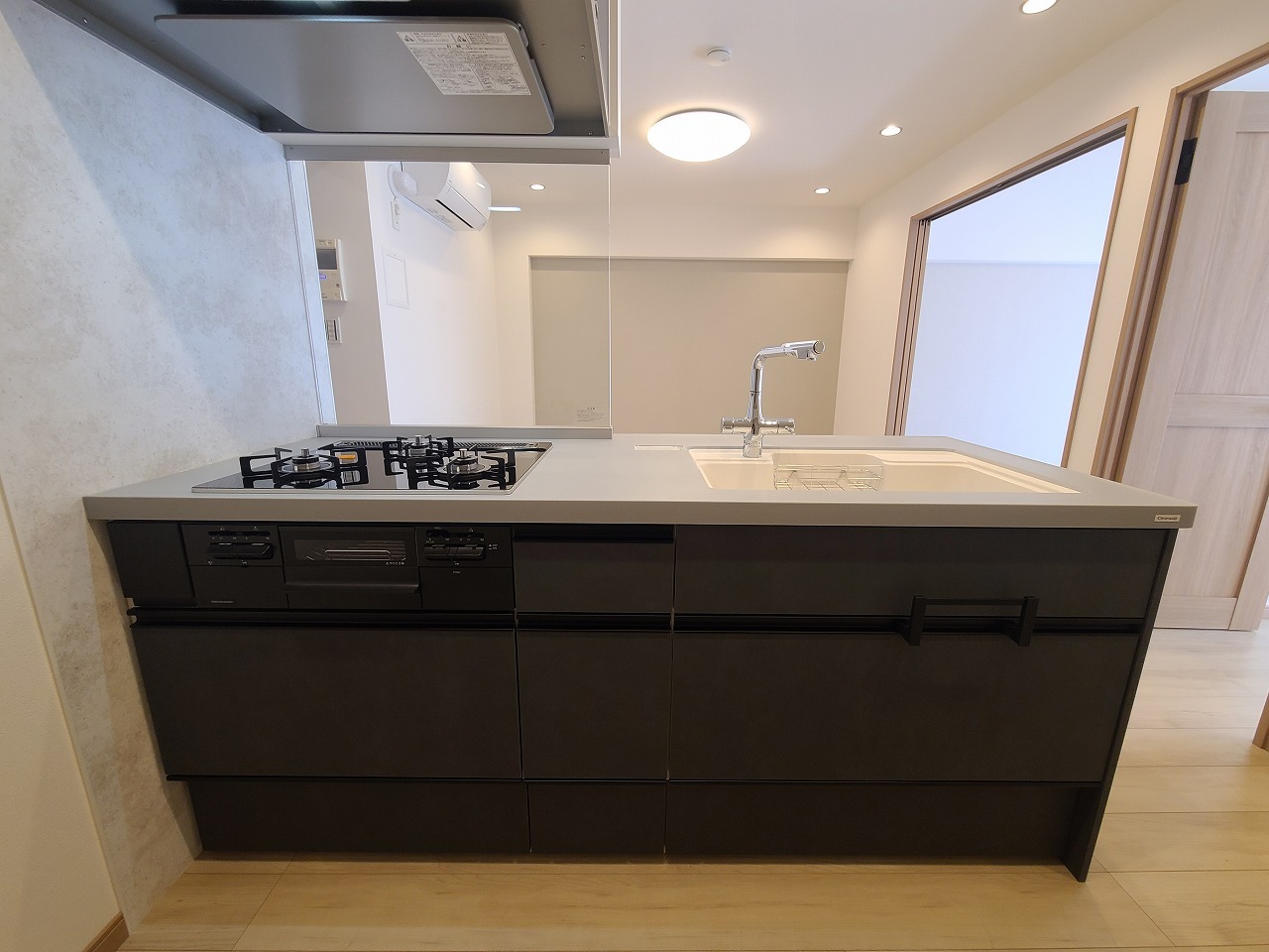 リビングにいる家族の顔が見渡せるカウンターキッチン。お料理もより一層おいしく、楽しく。食器棚を背面に設置しても十分な広さを確保しています。
