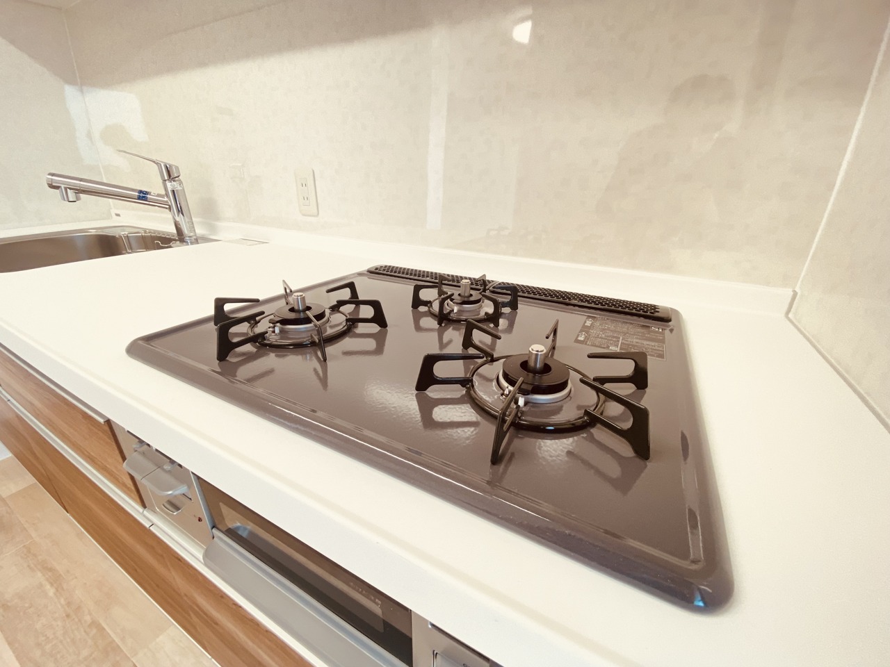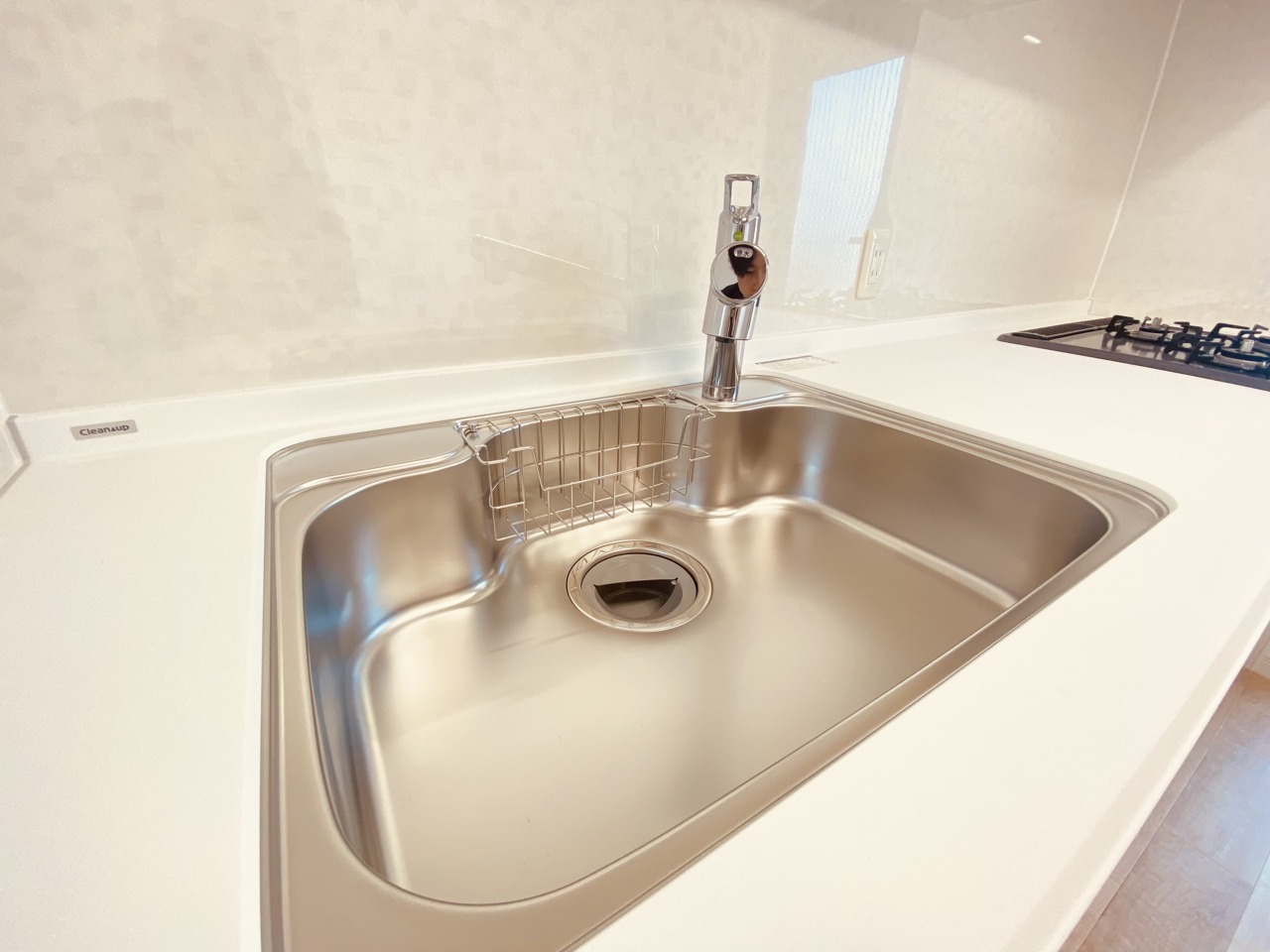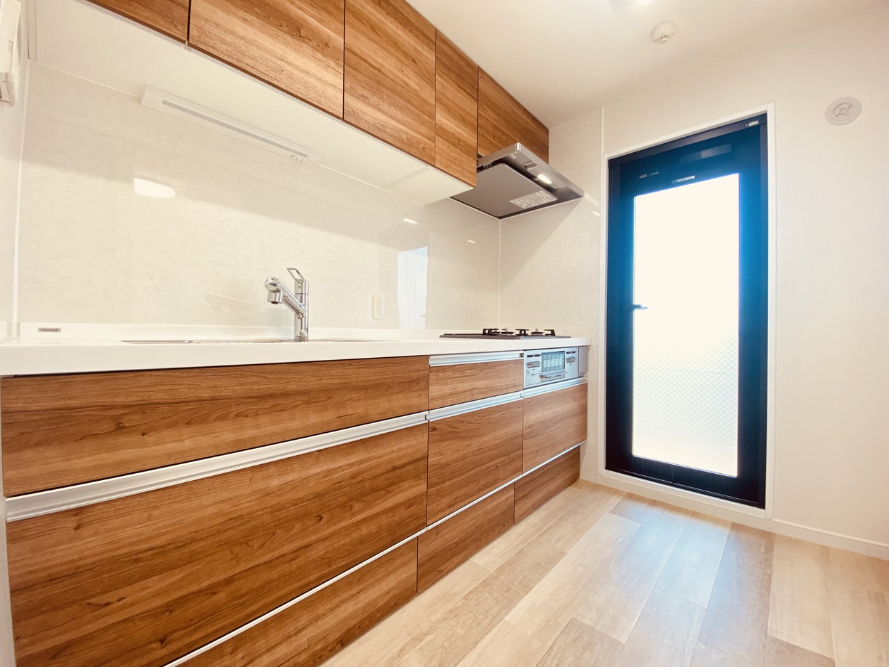収納量豊富なシステムキッチン。明るい光が差し込む窓も調味料置き場などに役立ちます。カウンターキッチンと違い、背面を広く使えるので自由度が高いのも嬉しいですね。