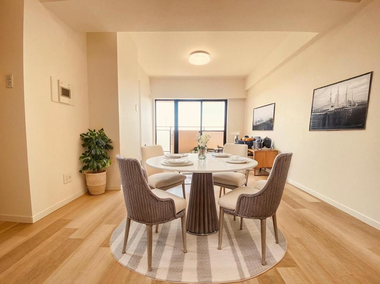 家族団欒のリビング。陽光差し込む食卓には家族の会話とスマイルが溢れます。いつまでもここで食卓を囲みたくなる、そう感じさせてくれるスペース。