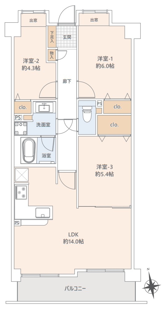 | 間取 | 3LDK (LDK14.0帖、洋室6.0帖、洋室4.3帖、洋室5.4帖) | ||