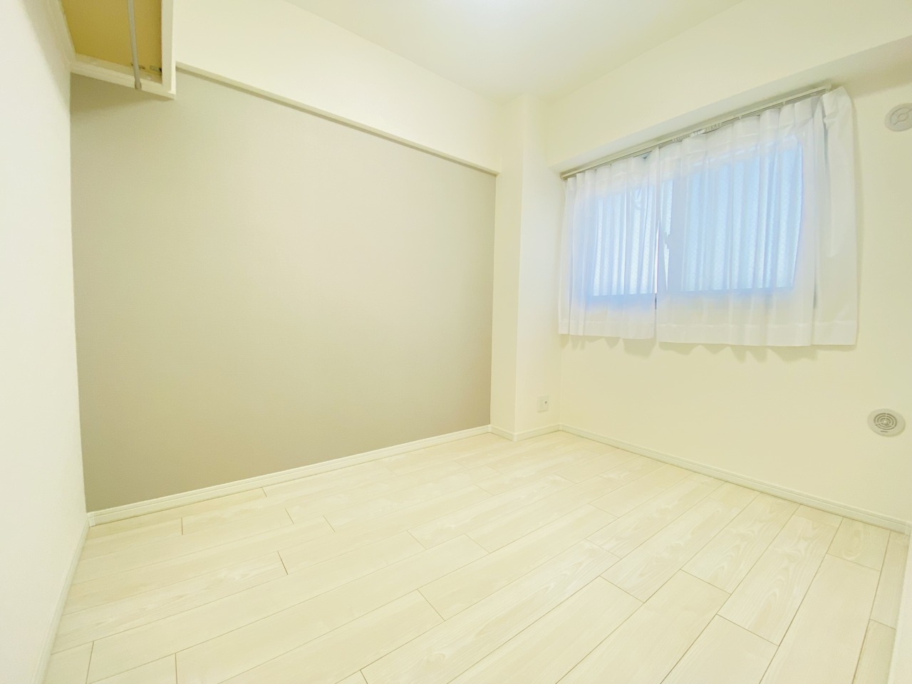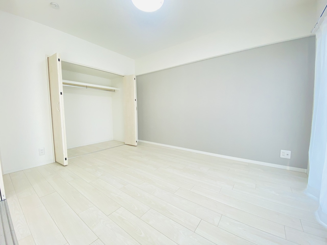 アクセントクロスを使用したオシャレな洋室。窓からそそぐ陽の光が眩しいベッドルームは、朝の目覚めが心地良く迎えられそうです。
