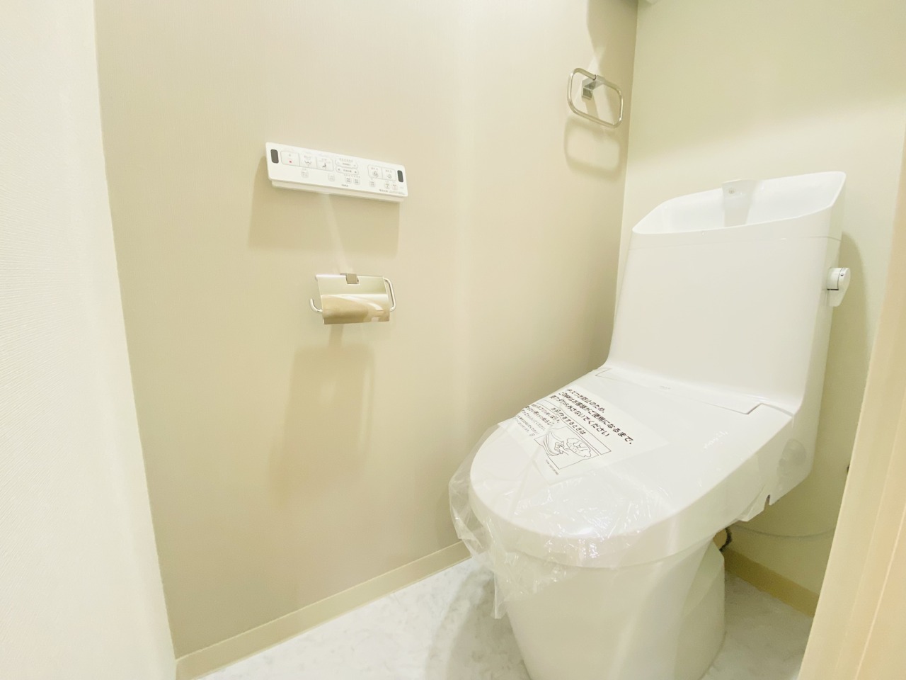 ウォシュレット機能付きのトイレ。収納もあり実用性も兼ね備えた造り。