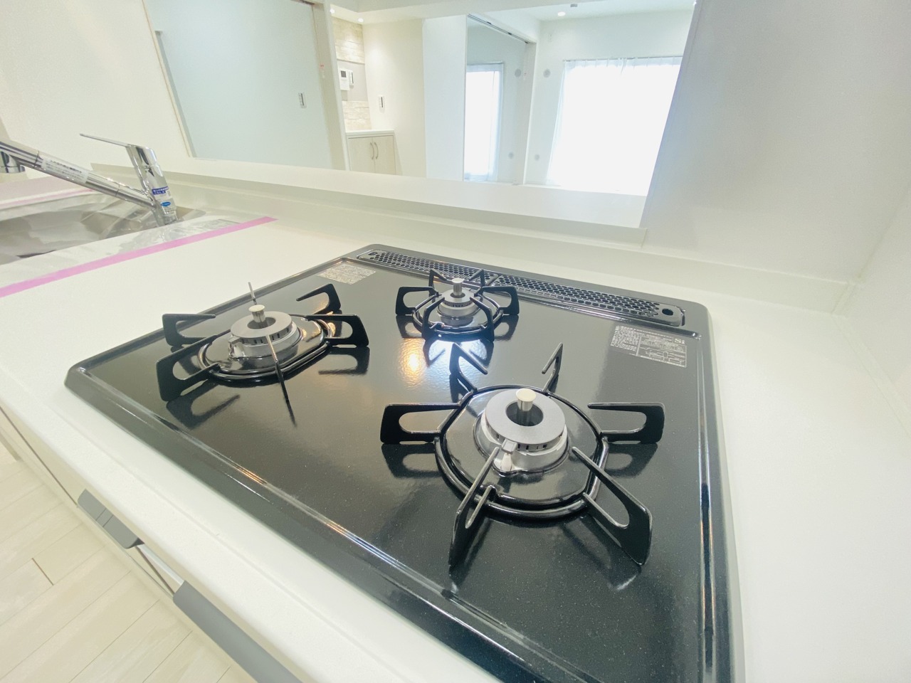 リビングにいる家族の顔が見渡せるカウンターキッチン。お料理もより一層おいしく、楽しく。食器棚を背面に設置しても十分な広さを確保しています。