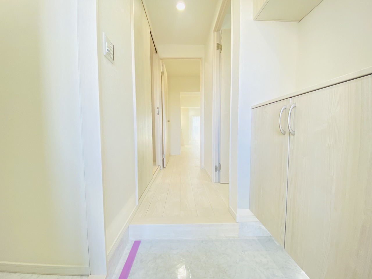 明るく開放的な玄関、靴の脱ぎ履きもしやすく、収納も豊富でご家族皆様の靴をスッキリ収納できます。