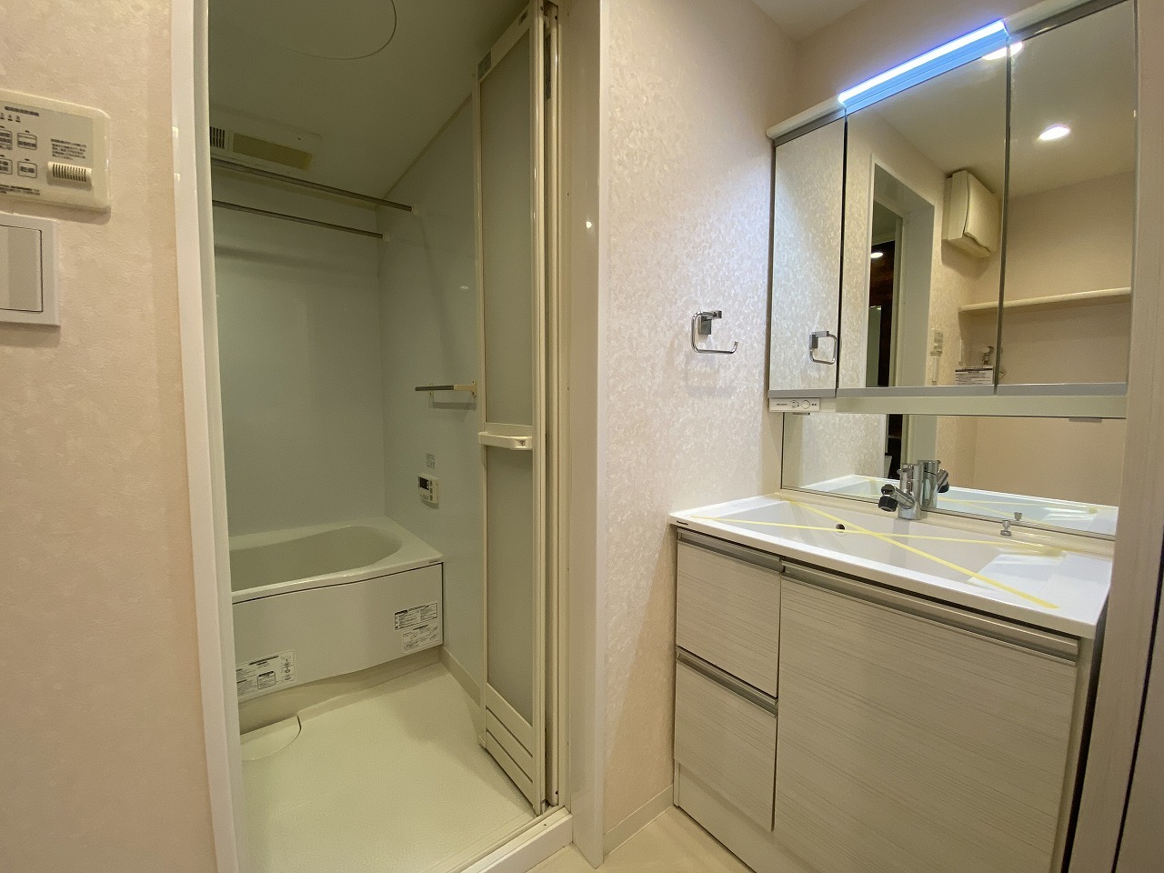 収納豊富な三面鏡付洗面化粧台。水回りのあれこれがキレイに収まりそうですね。