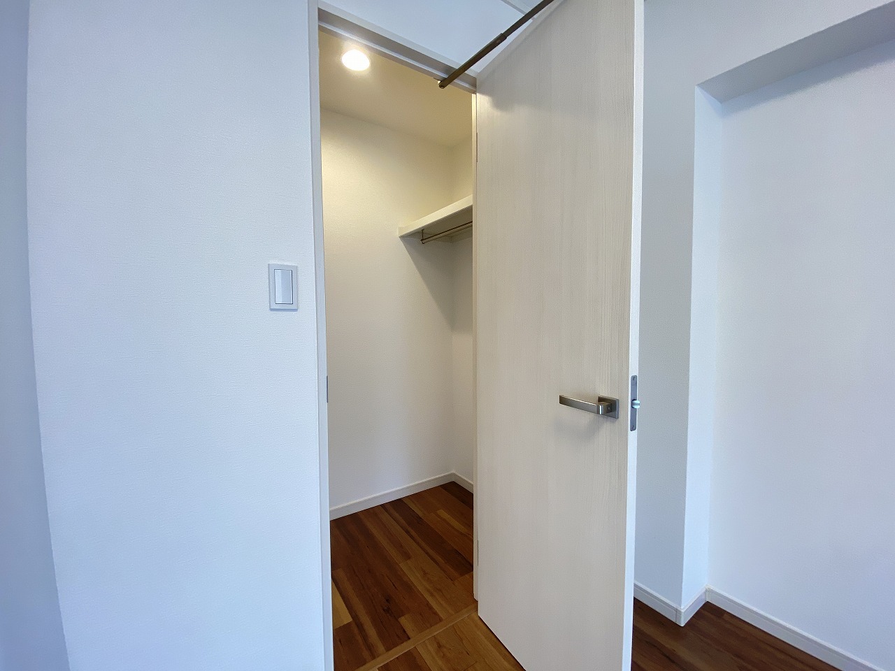 部屋と部屋の隙間をうまく使ったスリムな収納スペース。