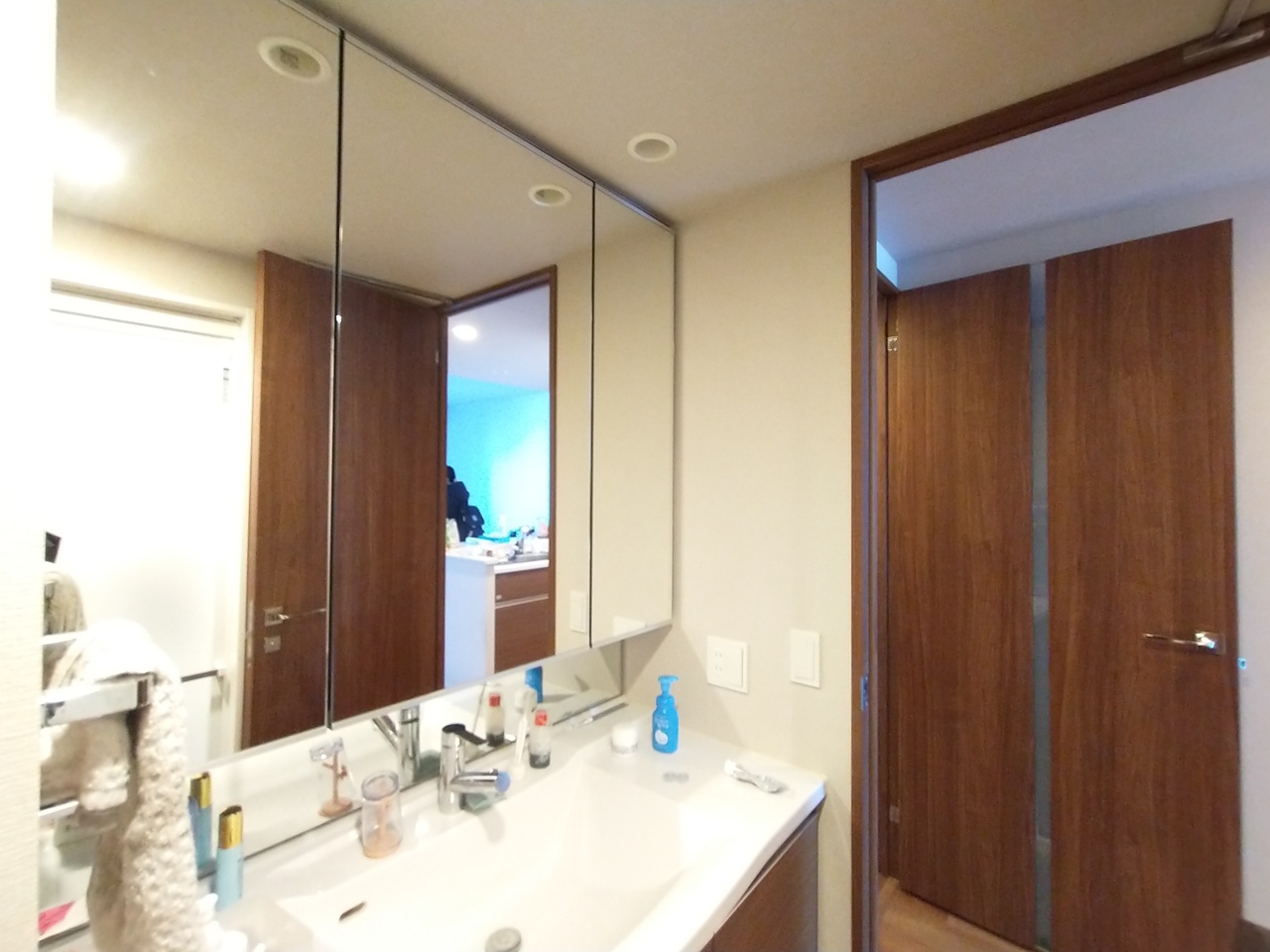 化粧台はやっぱり色が一番。シャワーヘッド付きの収納充実タイプです。